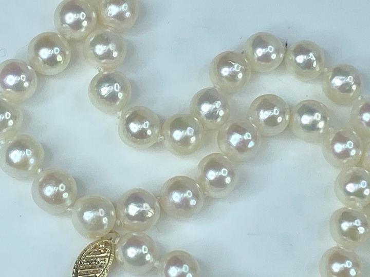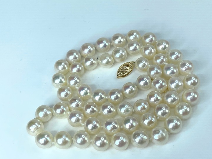 An vintage 14K yellow gold White Akoya Cultured Pearl necklace. Circa 1980-1990.