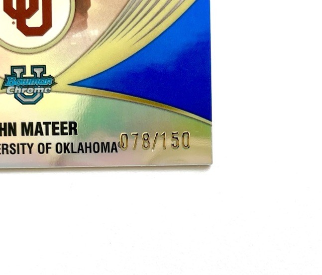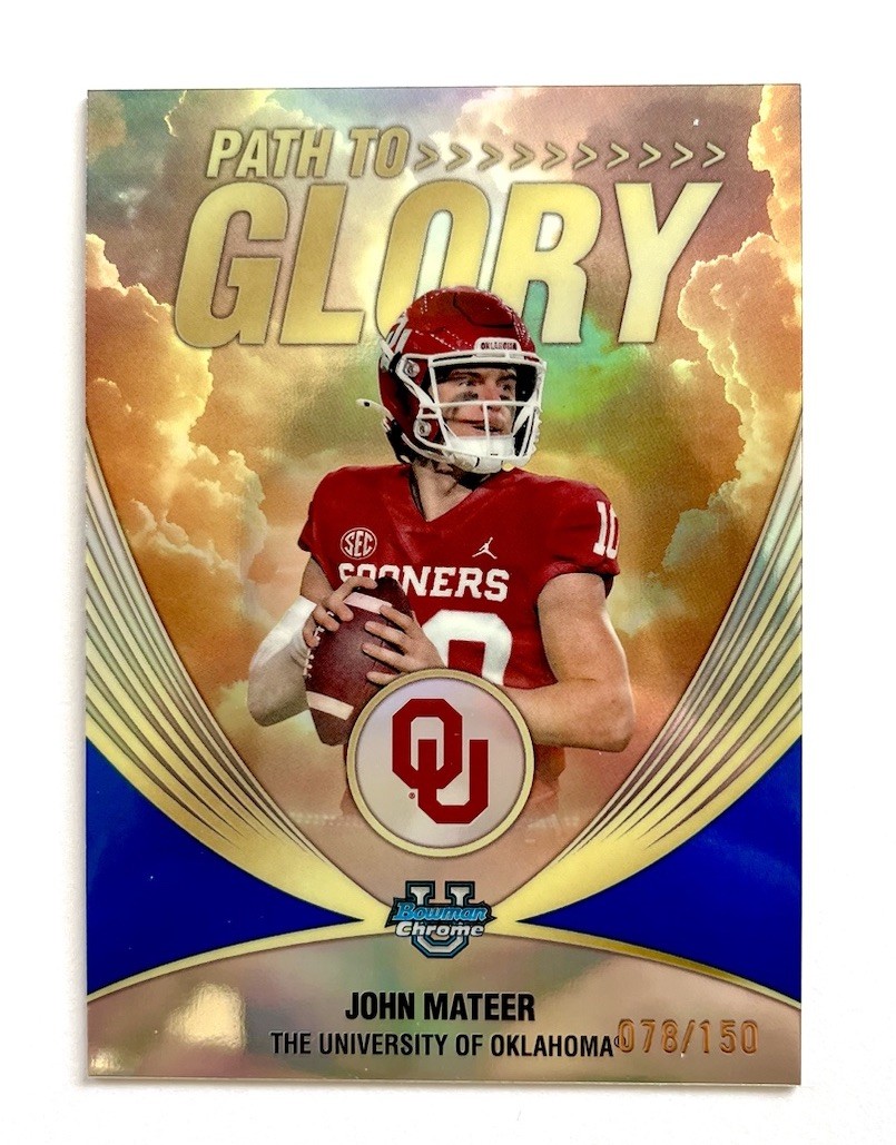 The product is a 2025 Bowman Chrome University of Oklahoma Blue Refractor trading card featuring John Mateer. This original sports trading card is part of the 2025 Bowman Chrome University set manufactured by Topps. The card showcases the player in his Oklahoma uniform and is a parallel variety with a limited edition of only 150 copies produced. It is a collectible item for fans of football and trading card enthusiasts.