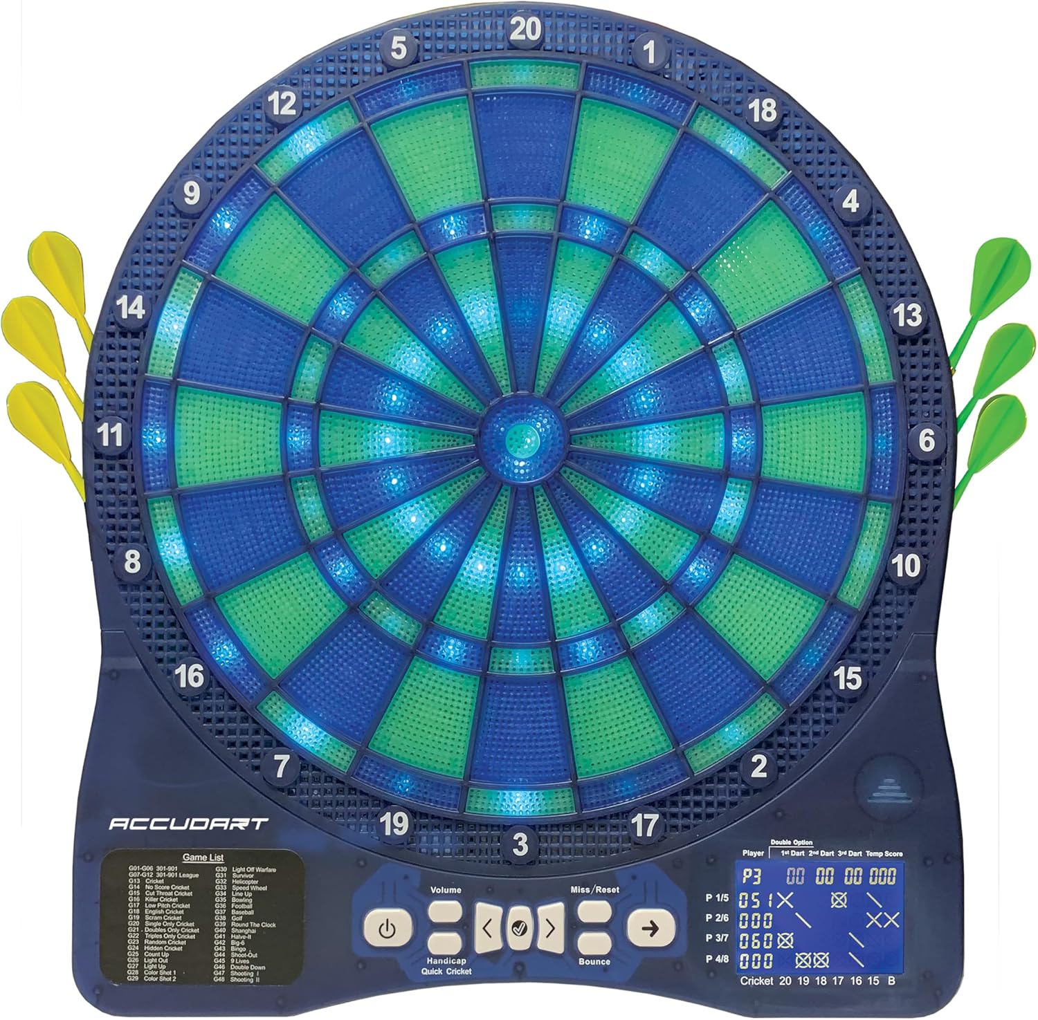 Step into exciting, fast‑paced gameplay with the Accudart Meteor Electronic Dartboard, designed for players who crave variety, challenge, and precision performance. Featuring 35 built‑in game modes and a remarkable 580 game variations, the Meteor offers endless replay value for beginners, recreational players, and seasoned competitors alike. Take on the virtual opponent to test your skills solo or level the playing field in group matches using enhanced options like double‑in/double‑out, handicap settings, points‑per‑dart analysis, and missed dart tracking. These advanced features provide meaningful insights that help refine accuracy, consistency, and strategy. The dual LED scoring displays deliver crisp visibility from multiple angles, complete with dedicated cricket marks for fast, easy‑to‑follow scoring. Designed for up to eight players, the Meteor brings family and friends together for classic soft‑tip dart fun. Safe, durable soft‑tip darts make it a great fit for all ages. With six included soft‑tip darts and replacement tips, the Meteor is ready for immediate play. Combining feature‑rich performance with Accudart’s trusted craftsmanship, this electronic dartboard is a must‑have centerpiece for any home game room or entertainment space.