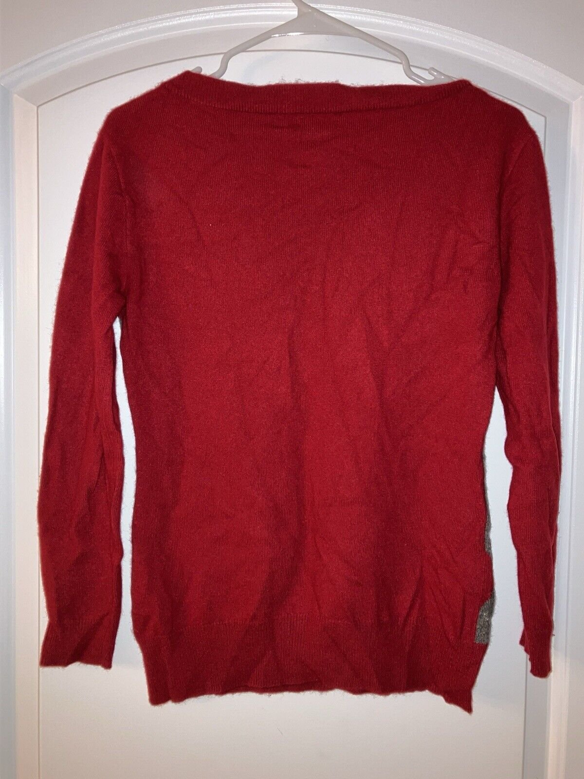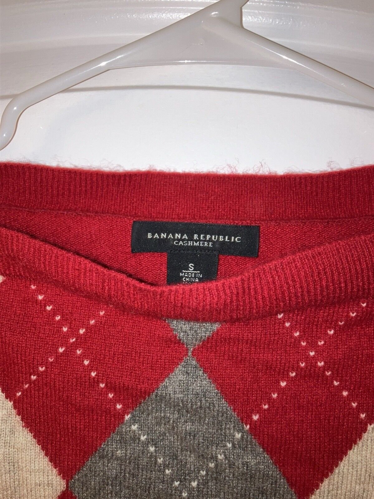 Elevate your wardrobe with this stunning Banana Republic sweater. Crafted from 100% cashmere, this pullover sweater is red and features a beautiful argyle/diamond pattern in tan and gray. The boat neck and long sleeves add a touch of sophistication to the sweater, making it perfect for any occasion.