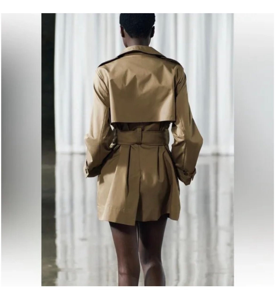 ZARA WOMAN COLLECTION Cropped trench coat made of cotton blend fabric. Notched lapel collar and adjustable long sleeves with buttoned straps. Front pockets. Adjustable self belt with buckle. Front double breasted buttoned closure. A trench coat that combines all the hallmarks of the classic trench coat with a shorter length to create a lightweight and very wearable garment. Its careful design is full of details such as the characteristic storm flaps or the epaulettes at the shoulders. The double-breasted front and a wide belt with buckle complete this timeless garment. Brand new with tags. Armpit to armpit 20” length 32”. Taupe brown