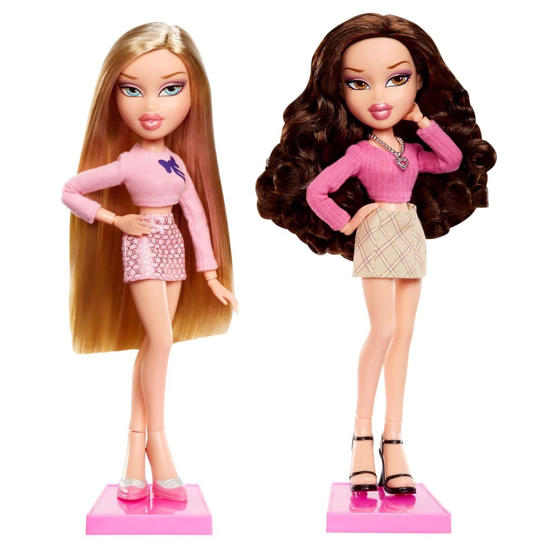 Includes 2 Bratz® x Mean Girls™ dolls, 2 tops, 2 bottoms, 1 jumpsuit, 1 dress, 4 pairs of shoes, 2 costume headbands, 2 pink flip phones, 2 purses, 1 coffee cup, 2 nail polish bottles, 2 doll stands, 2 clothing stands, 2 hairbrushes, 1 certificate of authenticity, and 6 exclusive stickers.