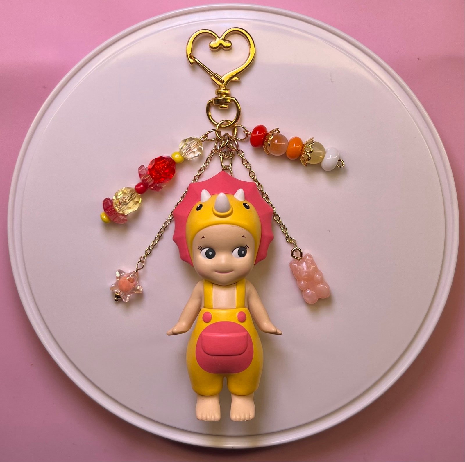 Authentic Dinosaur Series Sonny Angel ——> turned into a keychain with gold clip and chains + beads + charms