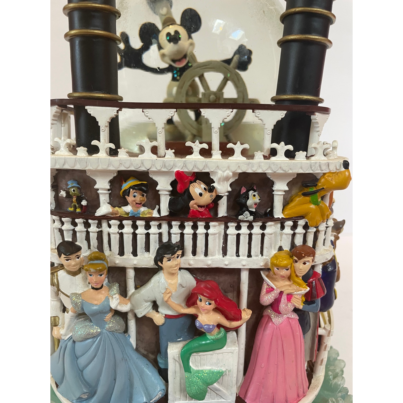 Enchanting Disney Steamboat Willie Liberty Belle River Boat Mickey Mouse Musical Snowglobe! This delightful snowglobe features iconic characters and a charming riverboat design. The snowglobe portion is in working order. The music turns, but clicks over, needing repair. Please note some imperfections: the top pillar balls are broken off, Dumbo is missing, and the gate between the pillars is absent. However, all other characters are in good condition. I've tried to capture the worn spots in the photos. Add a touch of Disney magic to your collection with this unique piece!