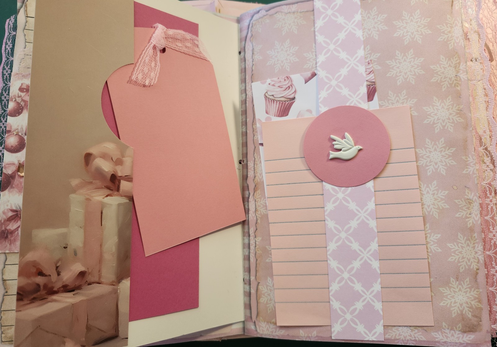 Large handmade Junk Journal. Cover features designer paper, lace, and hand glittered ornaments. This one-of-a-kind keepsake was created with designer papers of soft pinks in prints, along with cardstock, lace-edged pages, smooth writing pages, and beautiful images. Filled with pockets, tuck spots, journal cards, and large tags. Flip-up and Flip-out pages add hidden writing spots among the festive prints. Decorated with lace, and coordinated embellishments.