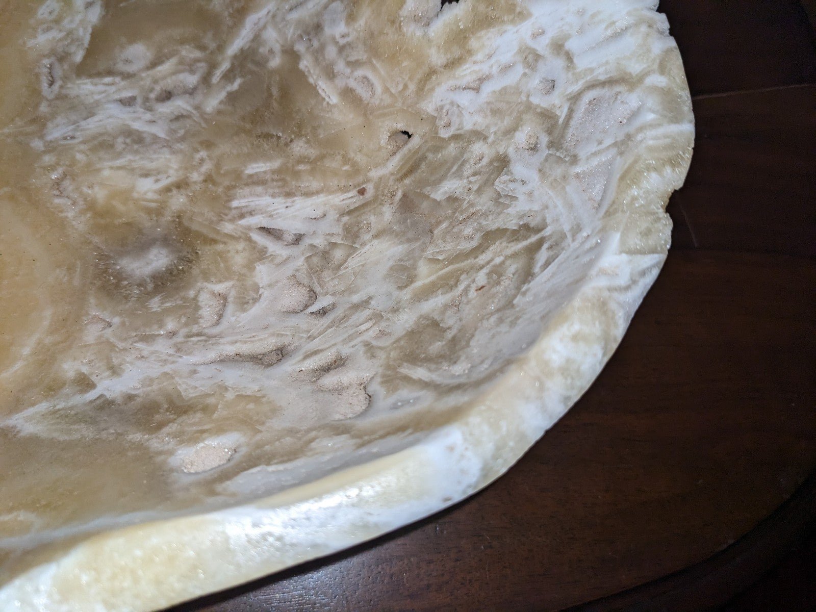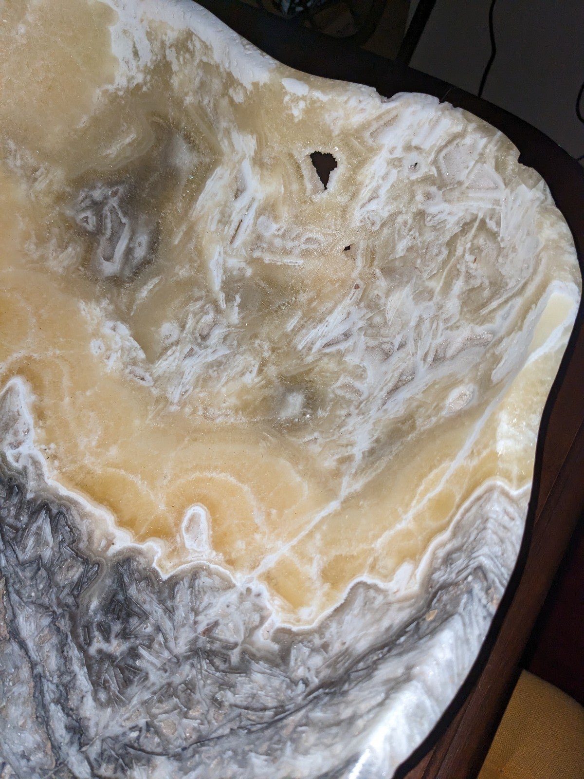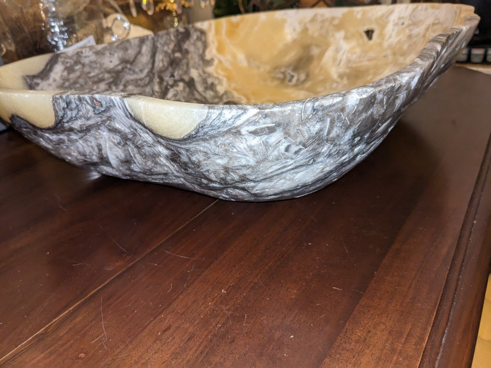 For your consideration is a huge natural Onyx unpolished gem of a bowl with outstanding character. The depth is approximately 4 3/4 to 5 inches. Note the beautiful inclusions, fissures and tiny openings that allow light to glow through. The length is 20 1/2 to 21 1/4 inches; width 15 1/2 to 16 1/4.