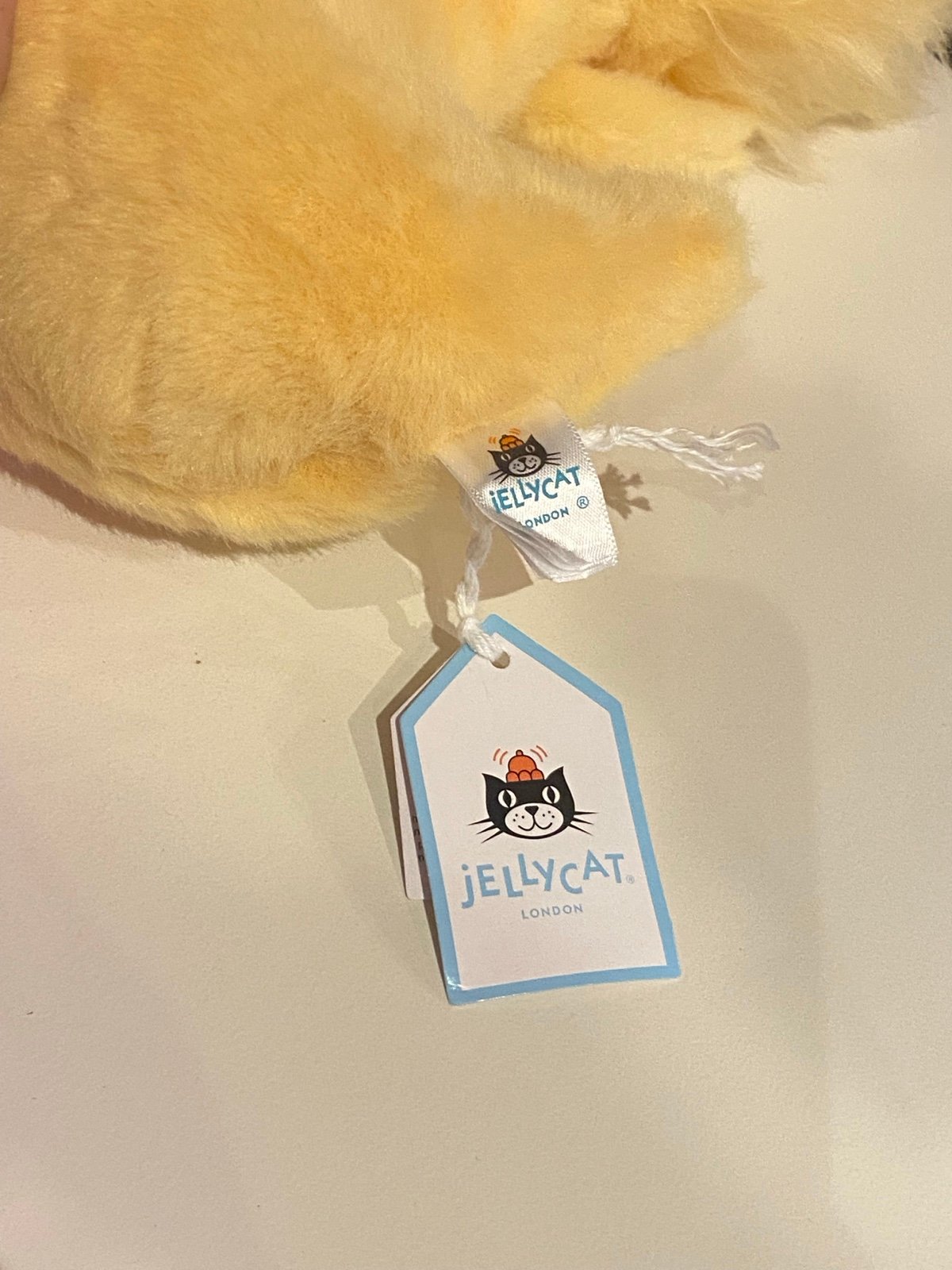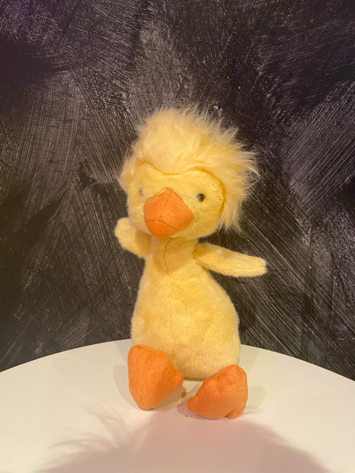 Soft and cuddly Jellycat duck plush with fluffy yellow fur, orange beak, and feet. In great condition with original tag attached. Perfect for kids, collectors, or as a cute gift.