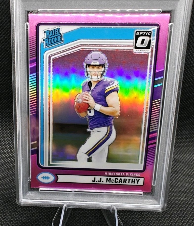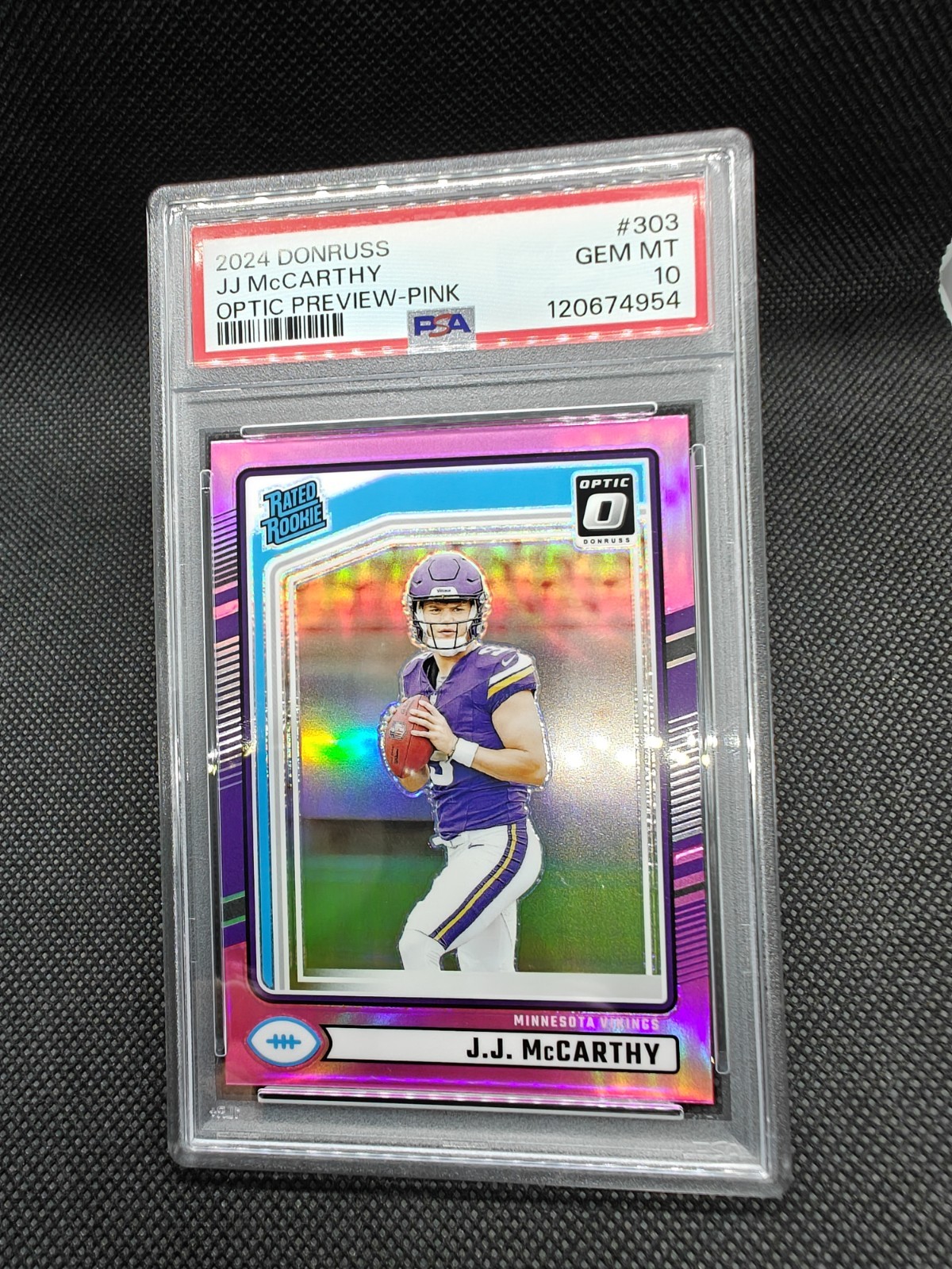 The product is a J.J. McCarthy 2024 Panini Donruss Optic #303 Preview Pink Prizm Rookie RC trading card featuring the player from the National Football League (NFL). This original single card is part of the Panini Donruss series and is specifically labeled as a Rated Rookie card. The card is manufactured by Panini and is themed around sport, with features like being a refractor and belonging to a parallel/variety, making it a valuable addition to any sports trading card collection.