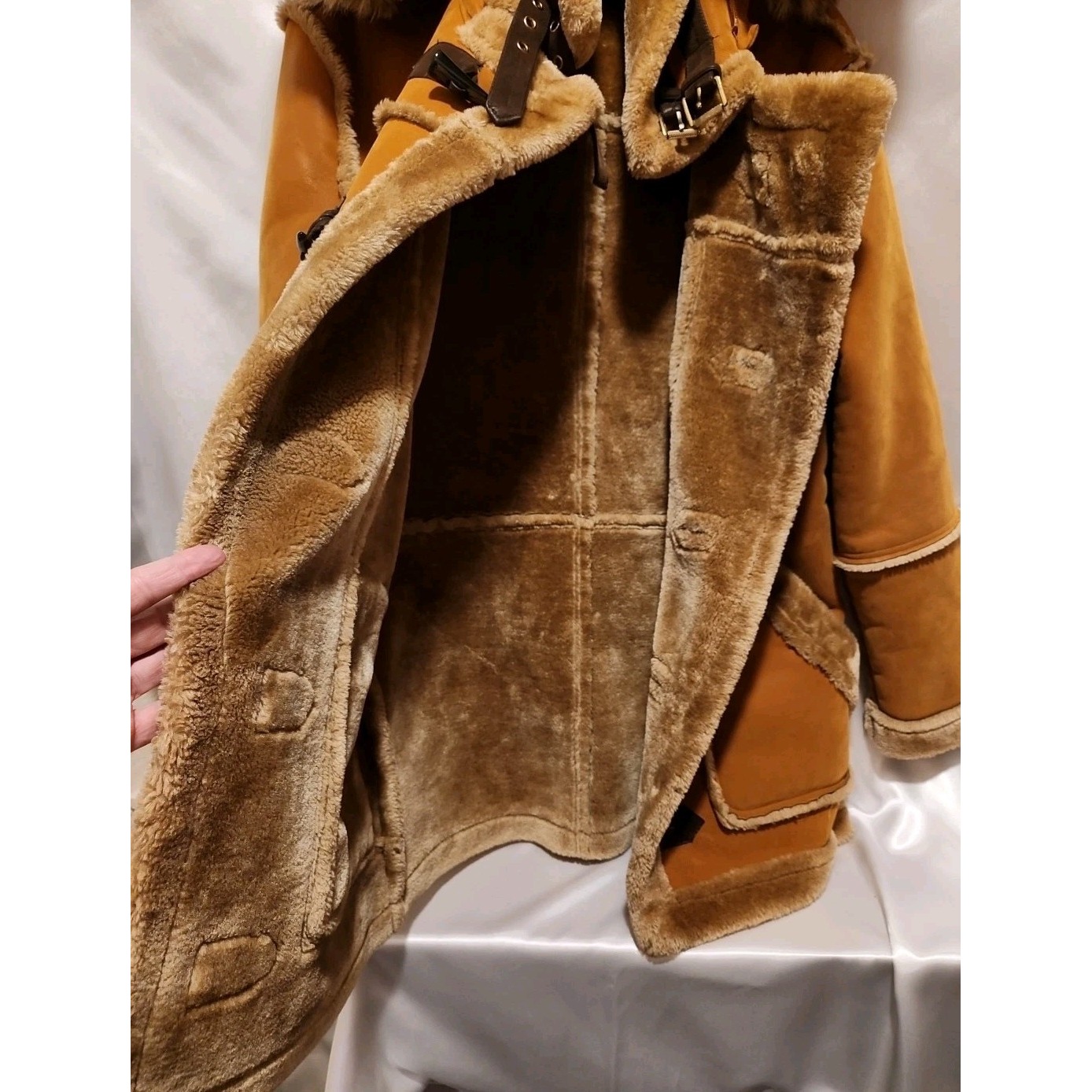 The Jordan Craig Cognac Denali Shearling Jacket is a stylish and classic winter coat for men. Made with faux fur and faux suede, this jacket features a plush faux shearling lining for extra warmth. The solid cognac color, button closure, and hooded design make it perfect for casual occasions during the cold season. With its denali shearling style, this jacket combines both fashion and function for a timeless look. This size M jacket also includes pockets for added convenience.