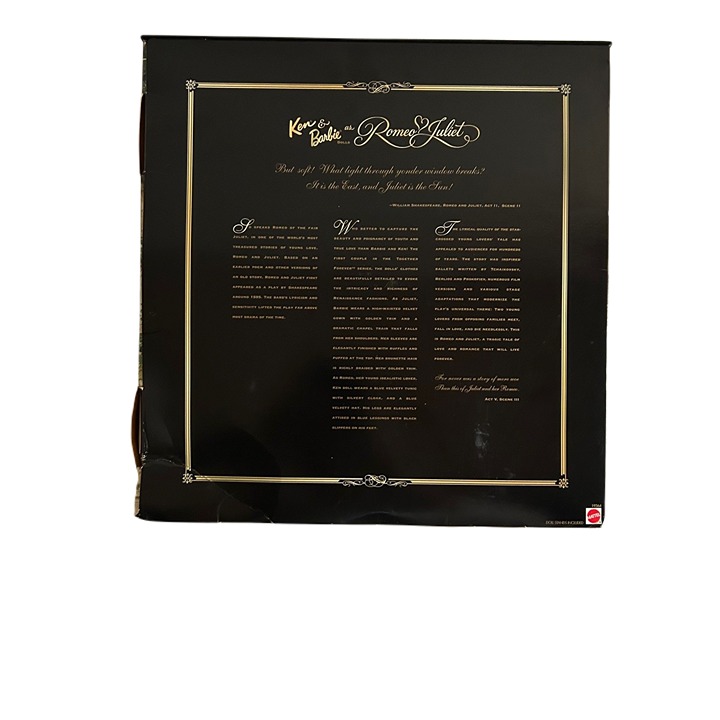 Ken & Barbie as Romeo and Juliet Doll Set Limited Edition 1997 Mattel 19364 NRFB William Shakespeare’s tale of Romeo and Juliet is one of the world’s most treasured stories of young love. Who better to capture the beauty and poignancy of youth and true love than Barbie and Ken. Their clothes are beautifully fashioned to capture the intricacy and richness of the fashions of the 16th century. As Juliet Barbie wears a high-waisted velvet gown with beautiful golden trim and a dramatic chapel train that falls from her shoulders. Her sleeves are elegantly finished with lace and puffed at the top. Her brunette hair is richly braided with golden trim. As Romeo her young idealistic lover Ken doll wears a blue velvety tunic with silvery sleeveless jacket a jeweled chain befitting his family’s stature and a blue velvety hat. His legs are elegantly attired in blue leggings and he wears black slippers upon his feet.