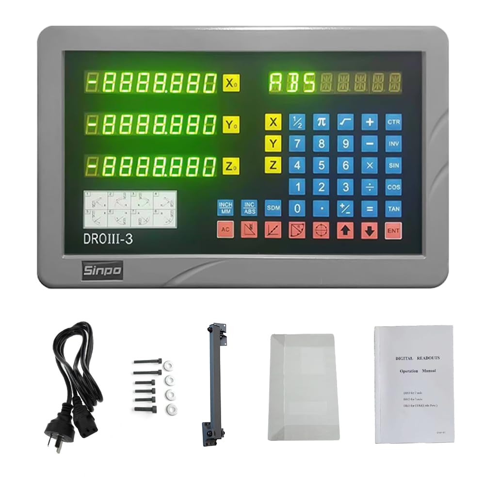 Product details Readout counter trigonometric function LCD display Input voltage 80-260V, 50HZ-60HZ (it can be plugged into 110 V or 220 V power supply directly) Zero Reset Inch/mm switch ABS/INC coordinate switch 200 Groups Coordinate Display Non-Volatile Memory (data retained in event of power loss) “1/2” function key Linear error compensation Sleep Switch 200 Points Auxiliary Zero Automatic Recognition and Storage of Scale Zero Reference Point Scale covers and backing plates Covers will be provided for all the scales in the kit The models/shapes of covers are determined by the position of installation on the machine. Cover for Z axis scale is different from those on X and Y axis. X axis scale can be directly mounted onto the rear side of the table which usually has a smooth surface. Brackets and screws for fitting reading heads Brackets in the photo are provided for illustration only. Different machines and installation on different axes may need different types of brackets. Occasionally, brackets may have to be customized in your own workshop. Therefore, our brackets can only be taken as "generic". X axis scales can be mounted onto the rear side of the table directly. The reading head and scale will be on the same level. Usually, no backing plate and brackets are needed to adjust the height of the reading head. One package of screws and washers will be supplied for each scale. What's in the box one 2-axis readout counter with power cord lathe-type swing arm clear plastic dust cover two linear scales of your choice with scale covers back plate for Z axis scale generic brackets for fitting reading heads on Y/Z axis two package of screws and washers for scale
