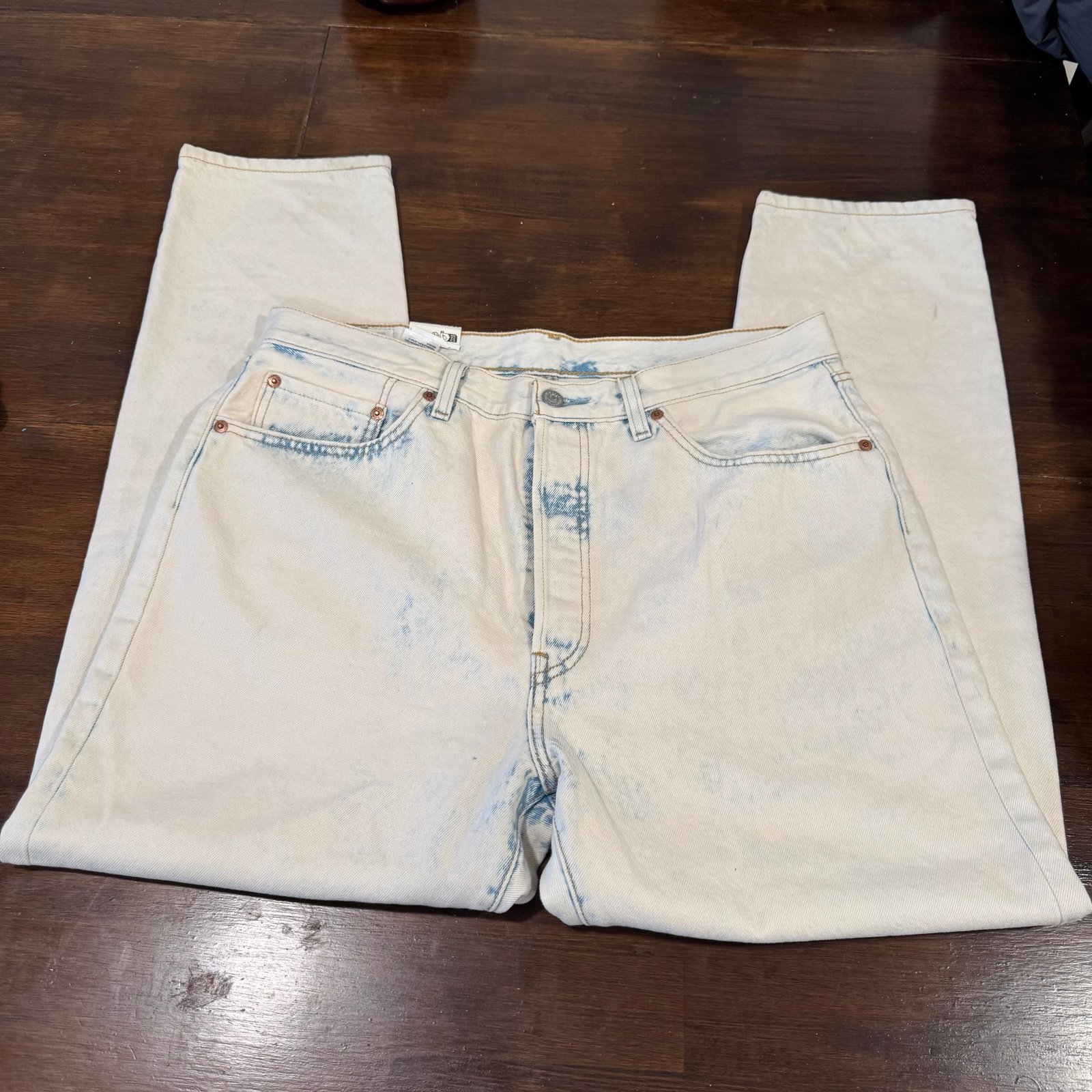 Light wash with medium wash accents. Straight leg high waist. Button fly. NWT