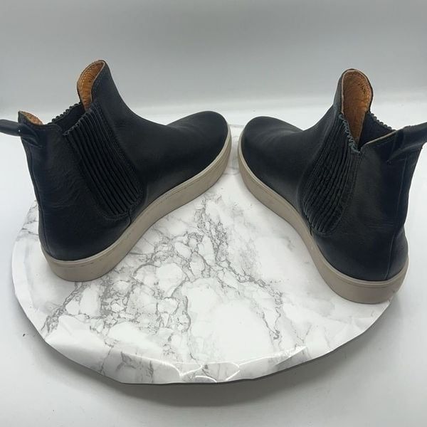 Black leather exterior with off white sole, textured ribbing verticals on the shaft for a little stretch and flair, back pull tab on the top of shaft to help put them on, leather lining and insole. Excellent condition. Size 7.5