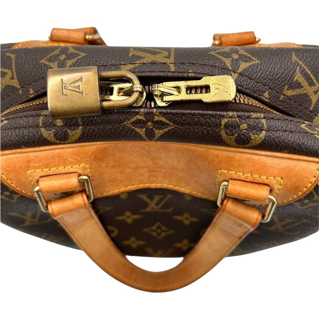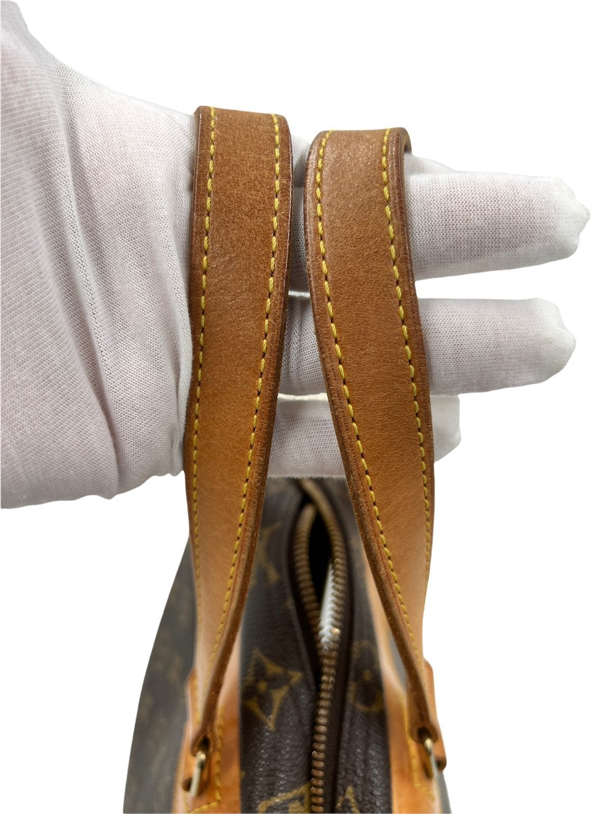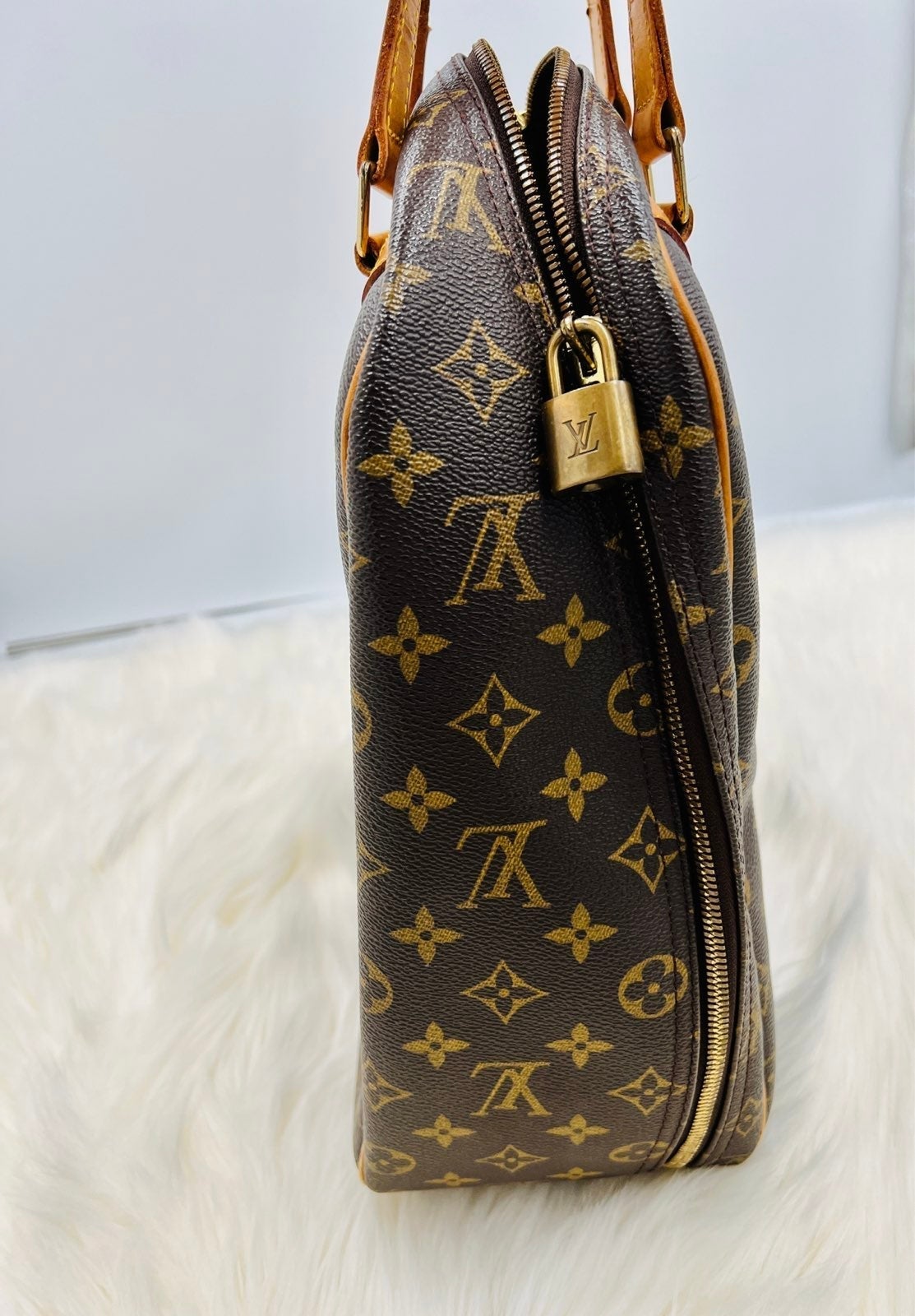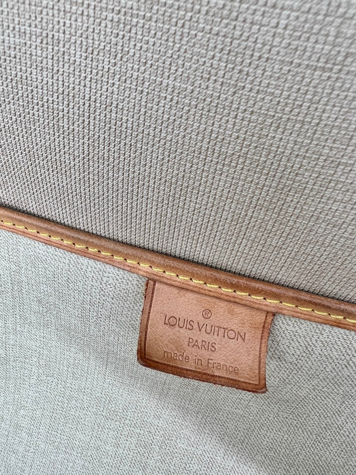 Authentic. Vachetta leather top handles, trim and piping. Goldtone hardware. Wrap around zippers open to a beige coated fabric interior with large patch pockets.