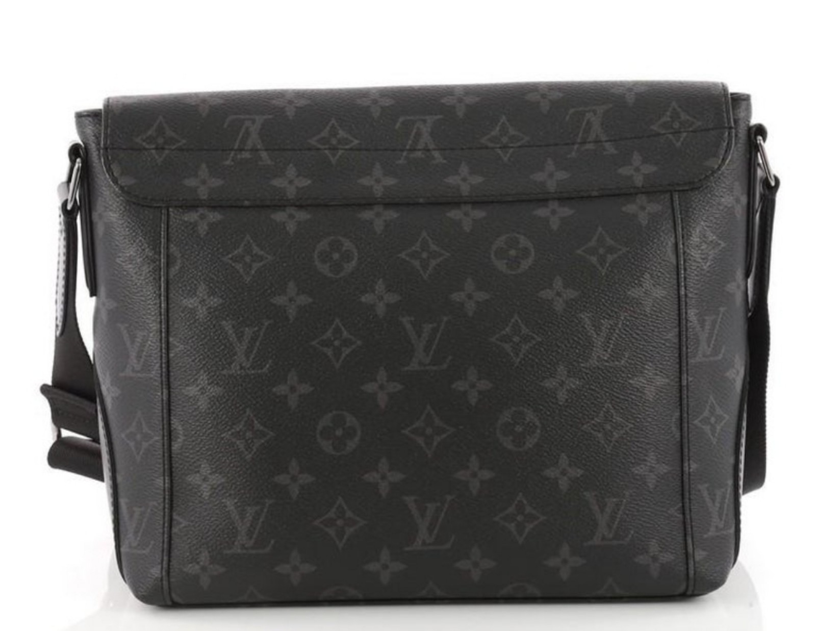 This messenger bag is a men's accessory crafted from black and gray Monogram Eclipse coated canvas with black leather piping. It features a black adjustable canvas shoulder strap and a flap closure. The bag is detailed with a polished silver-tone hardware plate on the front flap. The interior is lined with black canvas and includes three flat pockets for organization. The design is inspired by a vintage school bag, making it comfortable to carry. THIS MESSENHER BAG IS BRAND NEW, ONLY USED TWICE, IN VERY VERY GOOD CONDITION