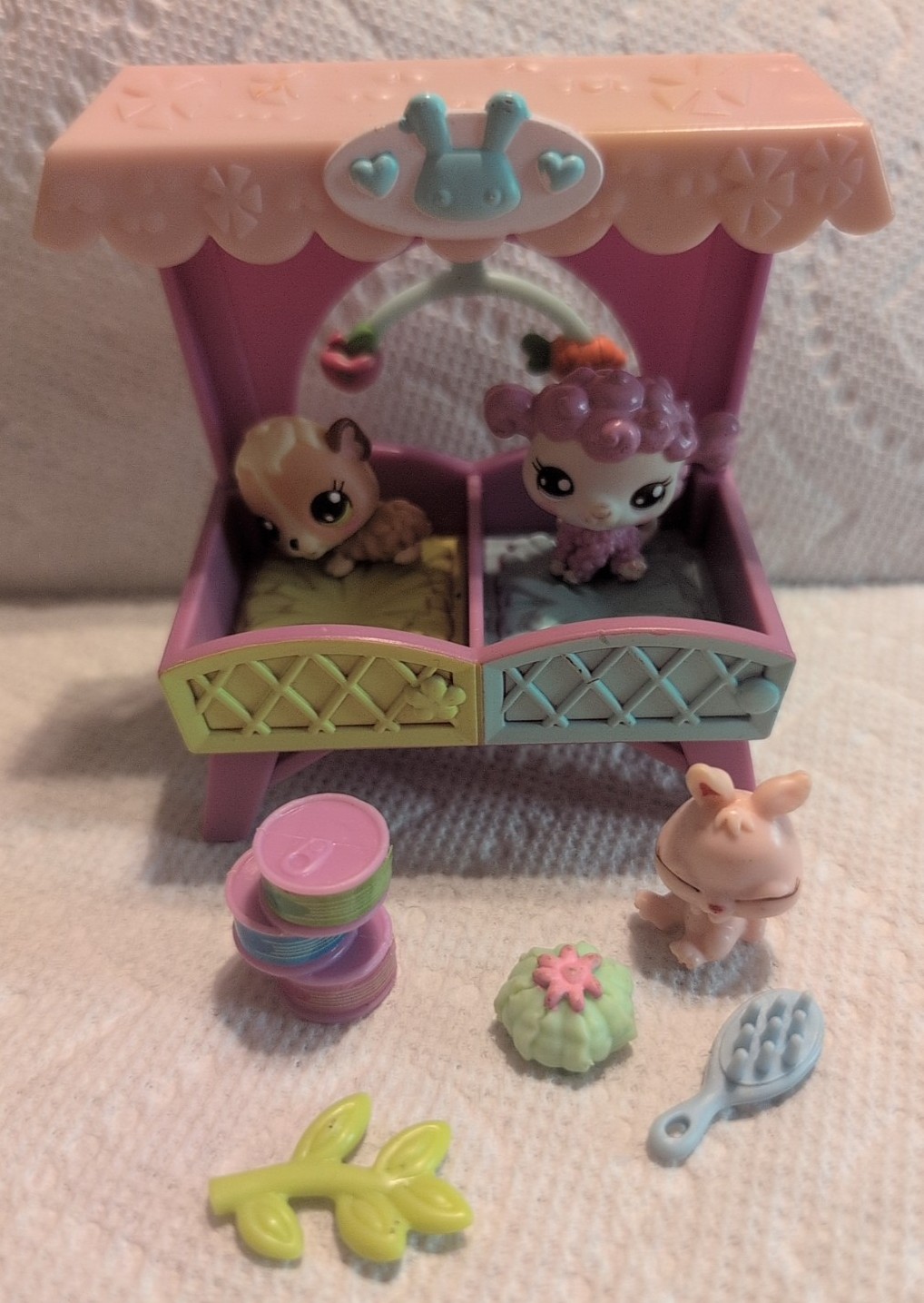 Authentic Littlest pet shop Naptime with babies crib with cutest pets baby hamster #2630, baby poodle #2498, pink newborn baby bunny and all accessories shown. Everything is in very good condition. Any questions please ask, I ship fast and use recycled shipping materials.