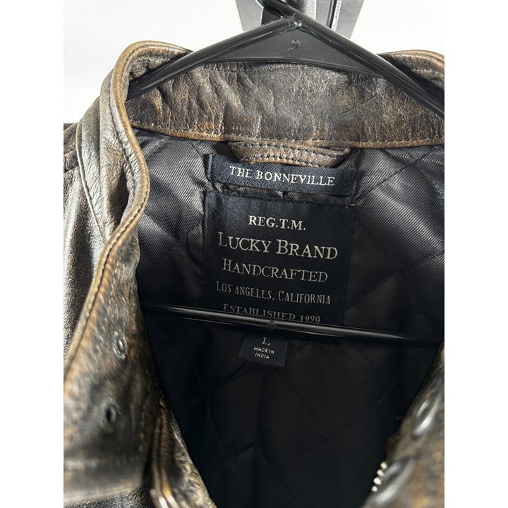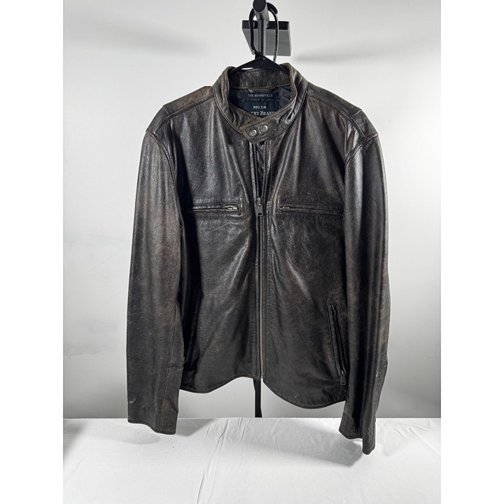 This is the Lucky Brand "The Bonneville" handcrafted leather jacket — a minimalist café racer style with a classic zip-front and snap collar. The quilted lining adds a bit of comfort and warmth without bulk. Ideal for fans of moto-inspired or heritage menswear.
