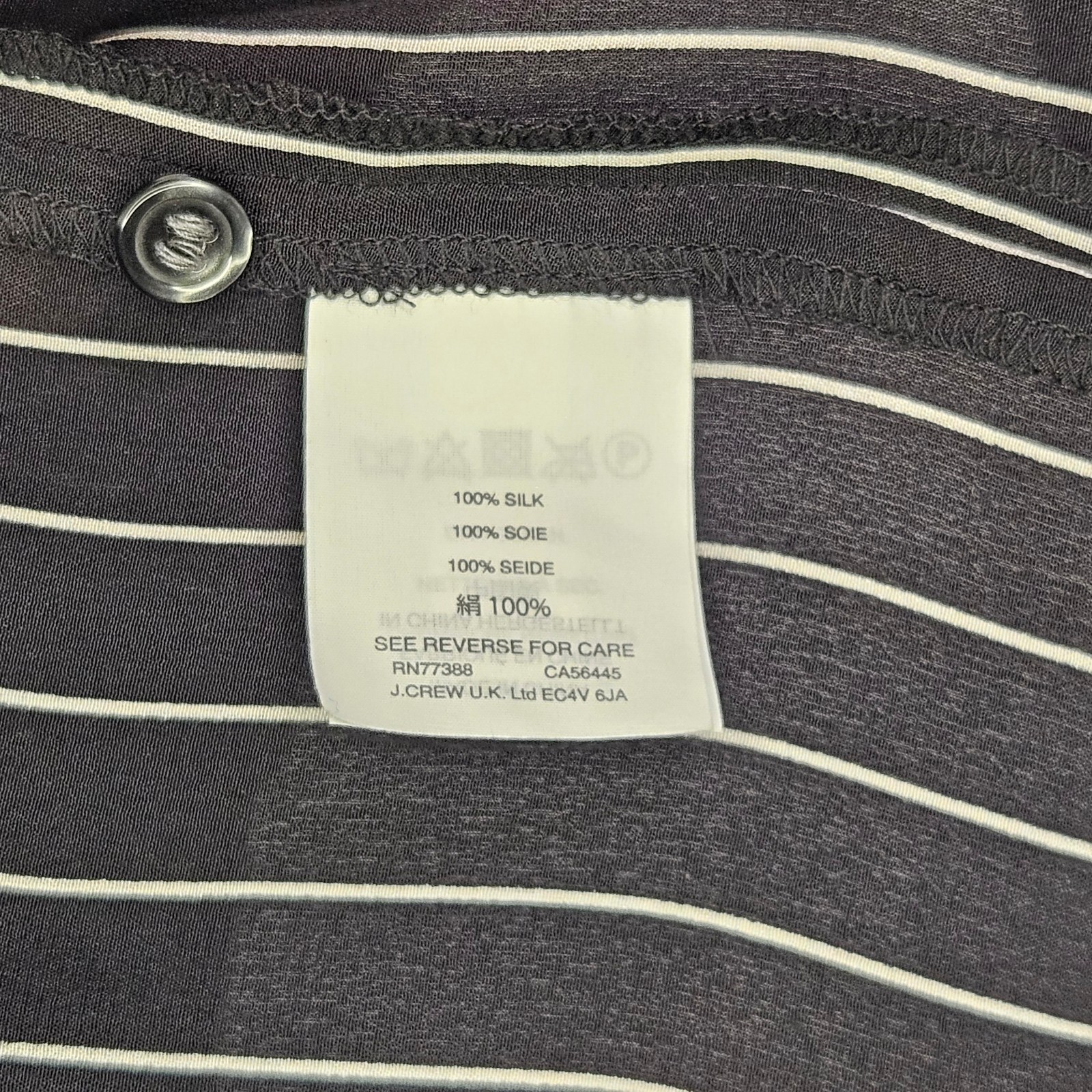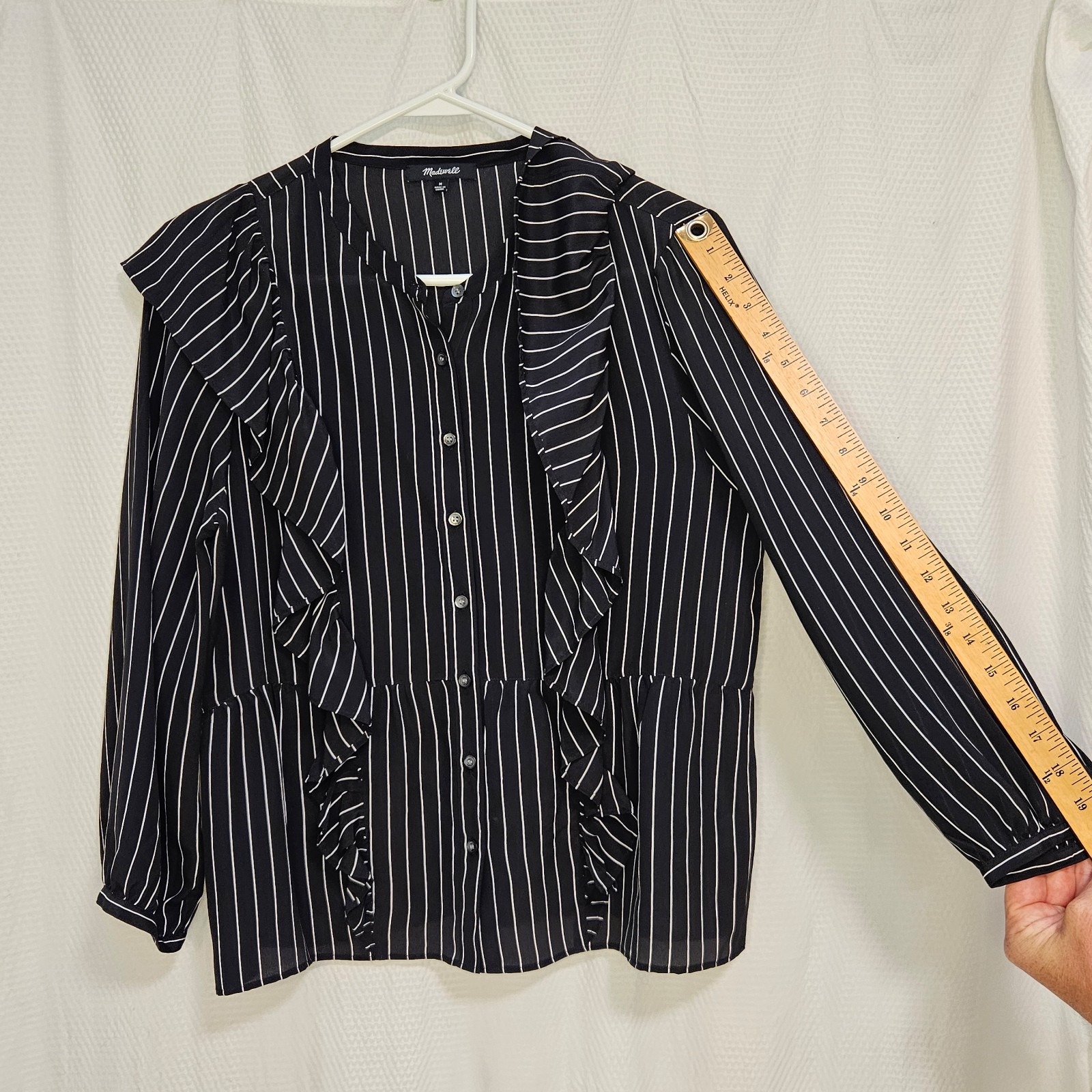 Elegant Madewell blouse crafted from 100% silk, featuring black fabric with vertical white pinstripes and soft ruffle details along the shoulders and front. Lightweight and luxurious with a flattering peplum-style waist and full button-front closure. Long sleeves with elastic cuffs for an easy, feminine silhouette. Perfect for work, date night, or elevated casual wear.