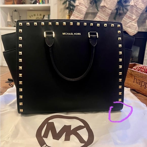 Black studded extra large Selma with gold detailing throughout I circled on the bottom right hand side of the bag has a stud missing. It’s easy to replace if you have a stud. I only carried this bag a few times and is an excellent condition otherwise.
