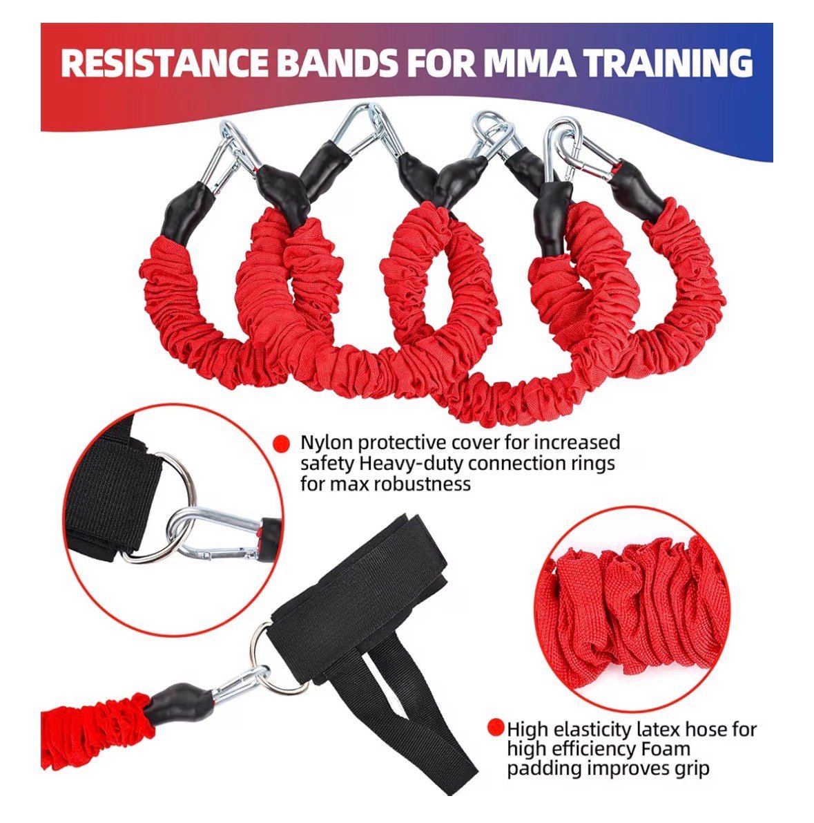 Enhance your boxing skills with resistance bands that boost strength, speed, and agility. This portable set offers a full-body workout, targeting legs, back, chest, shoulders, and core, suitable for all fitness levels. Includes an adjustable belt, foam handles, wrist sleeves, ankle cuffs, resistance bands (35 lb and 40 lb), boxing hand wraps, gloves, and a carry bag. Easy to set up and use, the bands fit most body types with adjustable belts and straps, making them ideal for home or outdoor workouts.