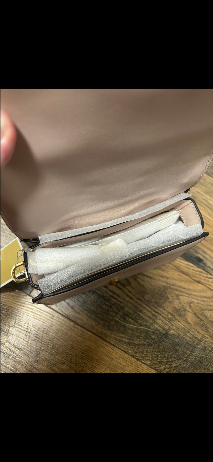 A ruffled bag leather snap soft pink. It is a mini bag. Polished leather; lining: polyester. Magnetic snap closure. color: soft pink. 2 interior slip pockets, back pocket & 3 card slots. There’s a gold plated chain strap.
