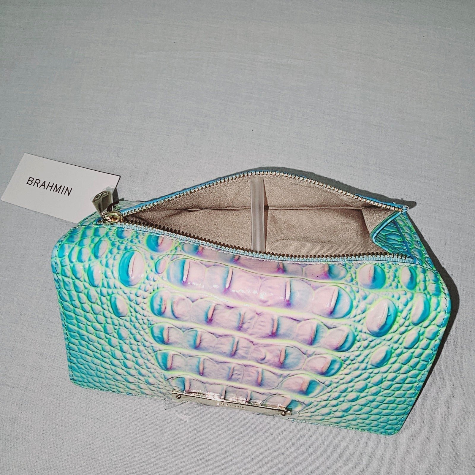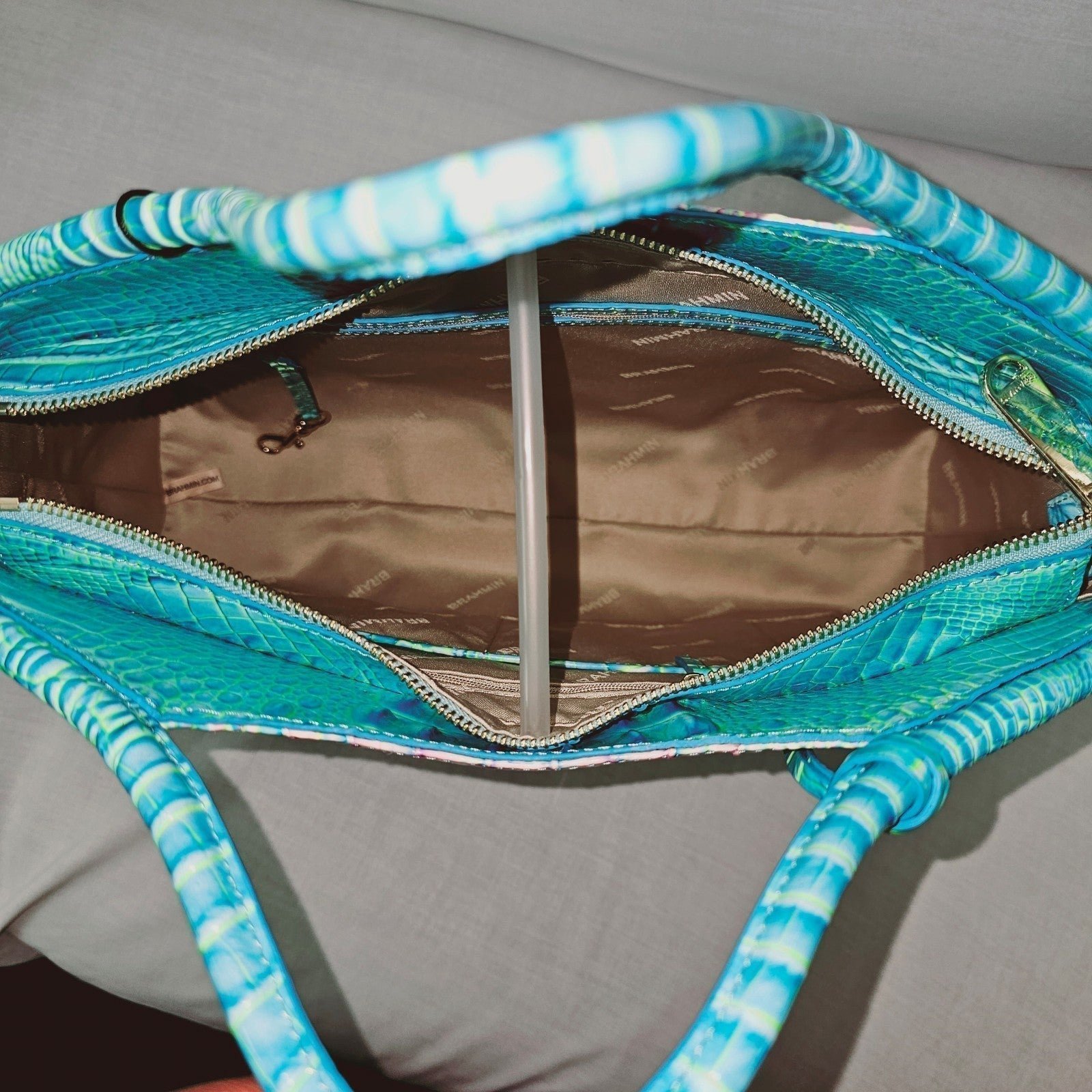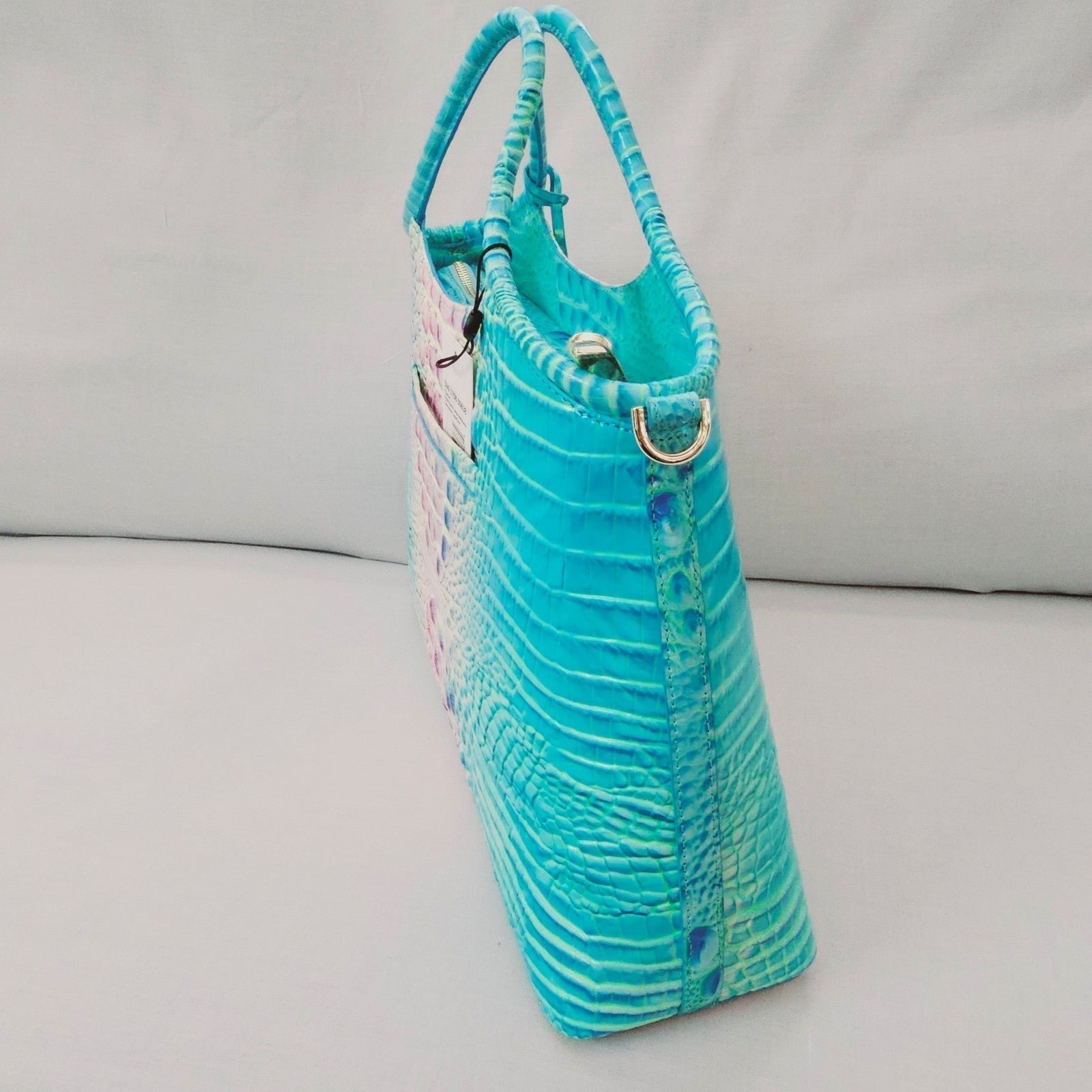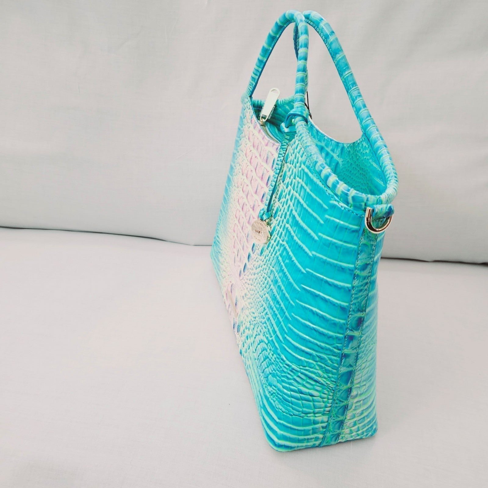This is a must have to add to your Brahmin collection. This set features gorgeous teal and light pink with subtle yellow and orange undertones in an Ombre pattern. This set is perfect for a casual outing or can compliment your style for a special occasion. This collection is considered retired as it was first introduced in 2021. Currently, this set is unavailable to purchase online and in stores. Includes Registration card, Brahmin card, detachable strap and Dust bag as pictured. Comes from a smoke/pet free home.