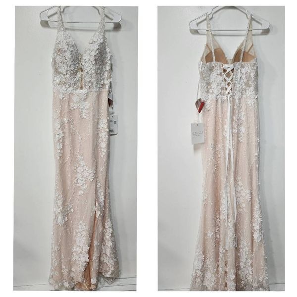 Look absolutely wonderful in this unique dress by Mac Duggal 11331. The sleeveless bodice has a plunging V-neckline with illusion inset, embellished straps, and a sheer corset back. The torso shows floral embroidered embellishments. The dress fits along your bust, waist, and hips, giving you a peachy look. The column silhouette allows a thigh-high slit in a full-length hem.