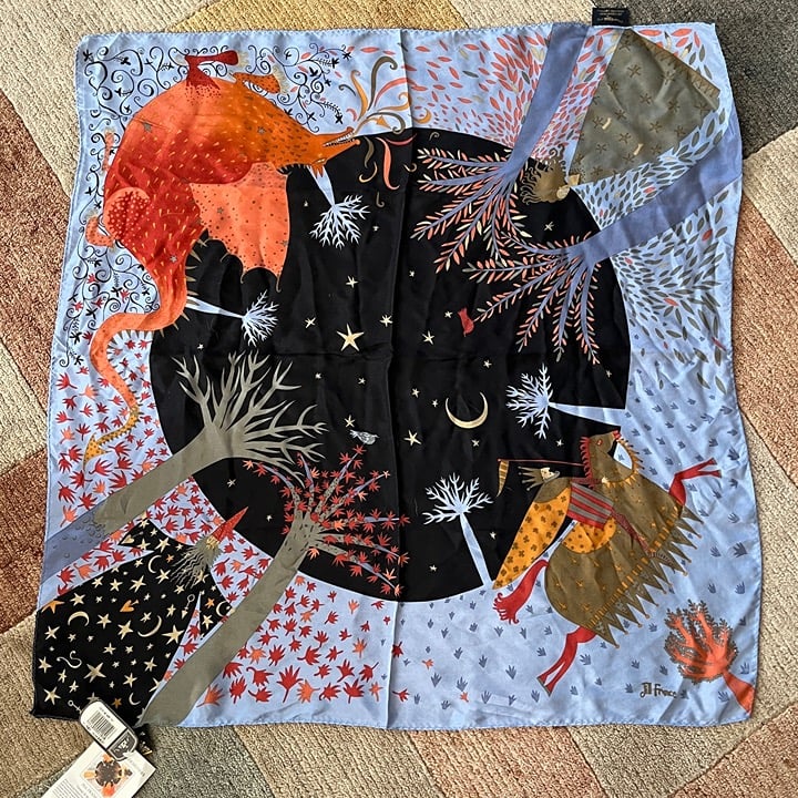 The NWT Young Brit Designers Jill France Silk Scarf by Tie Rack features a unique design of George and the Dragon, adding a vintage touch to your outfit. Made from luxurious silk fabric, this square scarf is 27 inches in length and is perfect for all seasons. With its multifunctional features and vibrant multicolor palette, this scarf is sure to elevate any ensemble with its stylish charm. Made in Japan, this scarf is a must-have accessory for any fashion-forward woman.