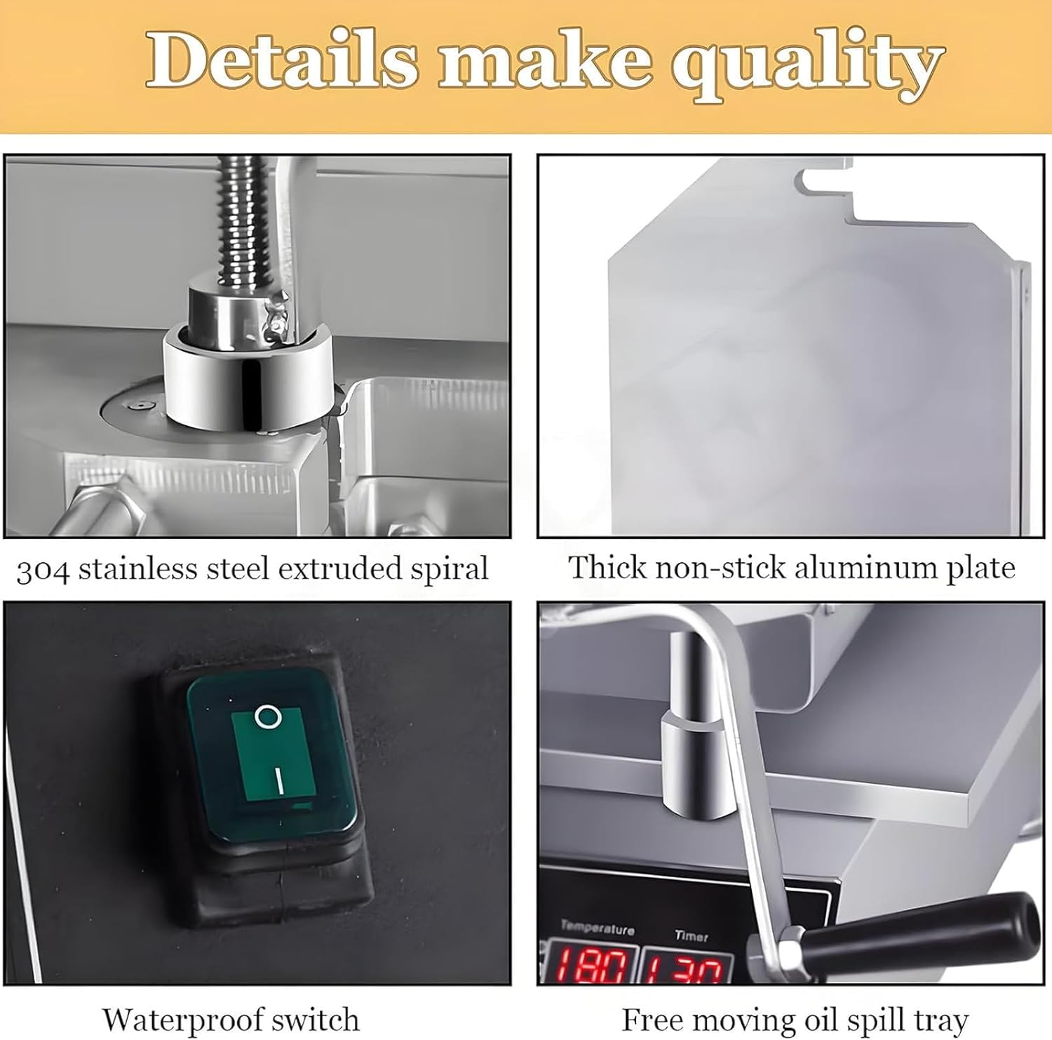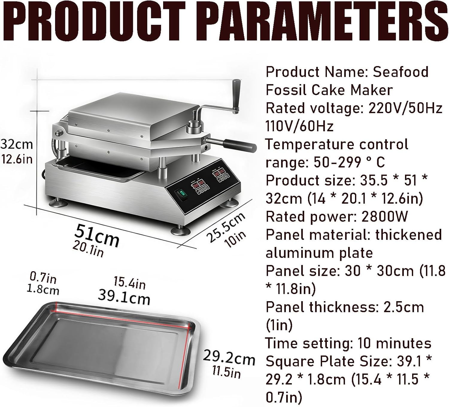 This seafood fossil cake machine is equipped with a smart CNC panel and built-in precise temperature control system, allowing you to adjust the temperature freely to achieve stable and ideal baking results every time. It adopts double-sided heating design to ensure even heating for consistent cooking and shaping, so you don’t have to worry about unevenly baked or misshapen snacksThe machine uses a 30*30cm thickened non-stick aluminum plate, which is durable, high-temperature resistant and very easy to clean—food won’t stick to the surface, and a simple wipe after use is enough to keep it tidy. With a stable fixed handle, the machine is easy to press and operate, effectively saving time and effort, even for long-term continuous use. With 2800W high power and a wide temperature control range, it heats up quickly and can adapt to different baking needs, whether you want soft or crispy snacksIt is perfect for home use, snack shops, restaurants and other occasions, helping you make delicious snacks conveniently and efficiently. The machine features a compact and sturdy structure that ensures stable and reliable performance during long periods of use. The thickened panel enhances heat retention and overall durability, significantly extending the service life of the machine. Its simple and intuitive design makes operation easy for users of all skill levels, whether you are a home cook or a commercial professional, bringing consistent convenience and efficiency to your daily snack-making routine