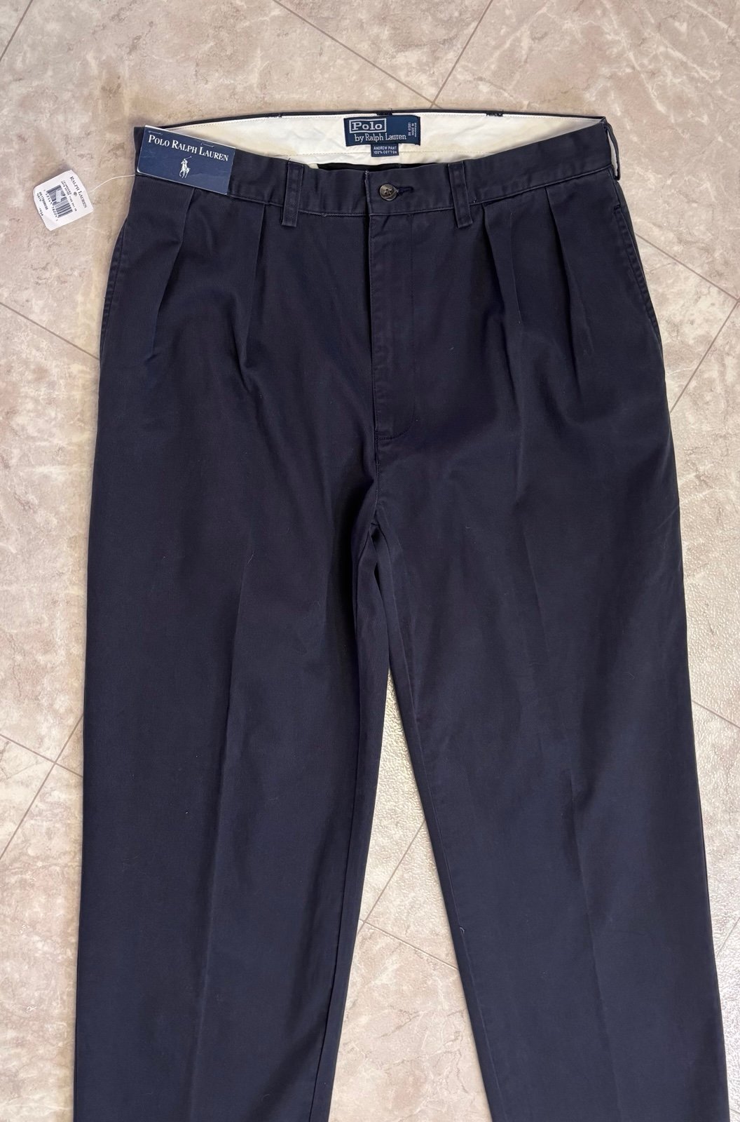 The Polo Ralph Lauren NWT “Andrew Fit” Pleated Front Chinos in Navy are a stylish and versatile addition to any man's wardrobe. Made from comfortable cotton material, these classic fit chinos feature a mid-rise waist and a 4-pocket design. The timeless chino style in a deep navy blue color makes them suitable for any season, whether it be winter, summer, fall, or spring. Perfect for a preppy city look, these designer pants from Polo Ralph Lauren are sure to make a statement in any outfit.