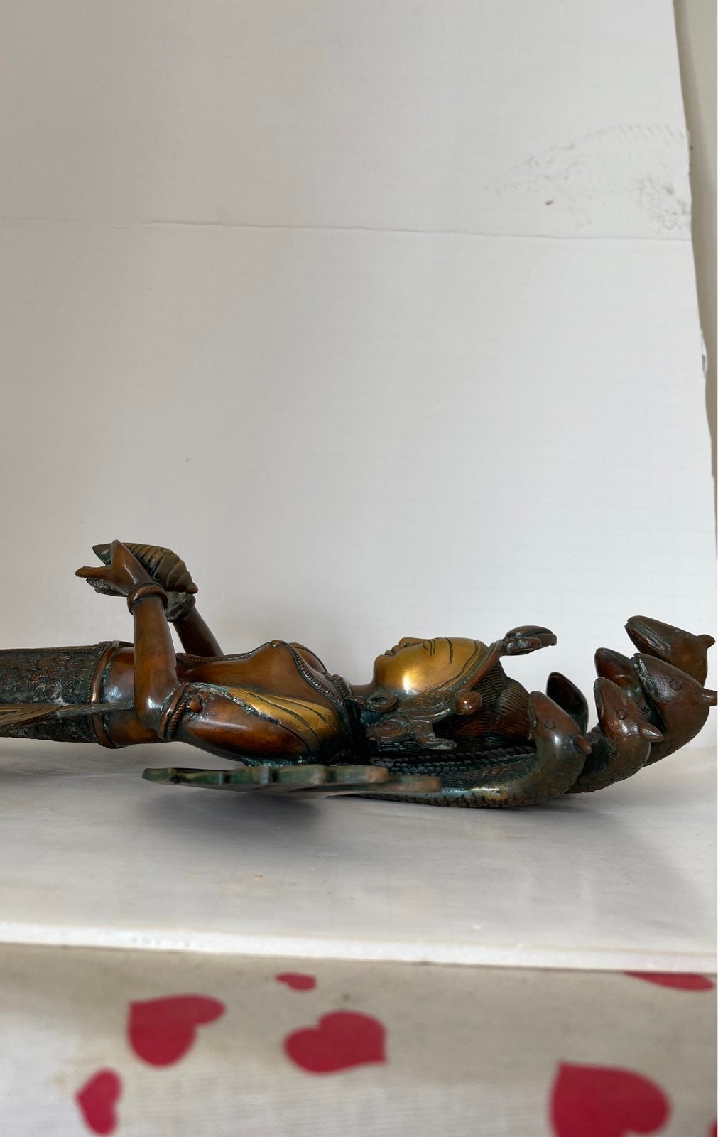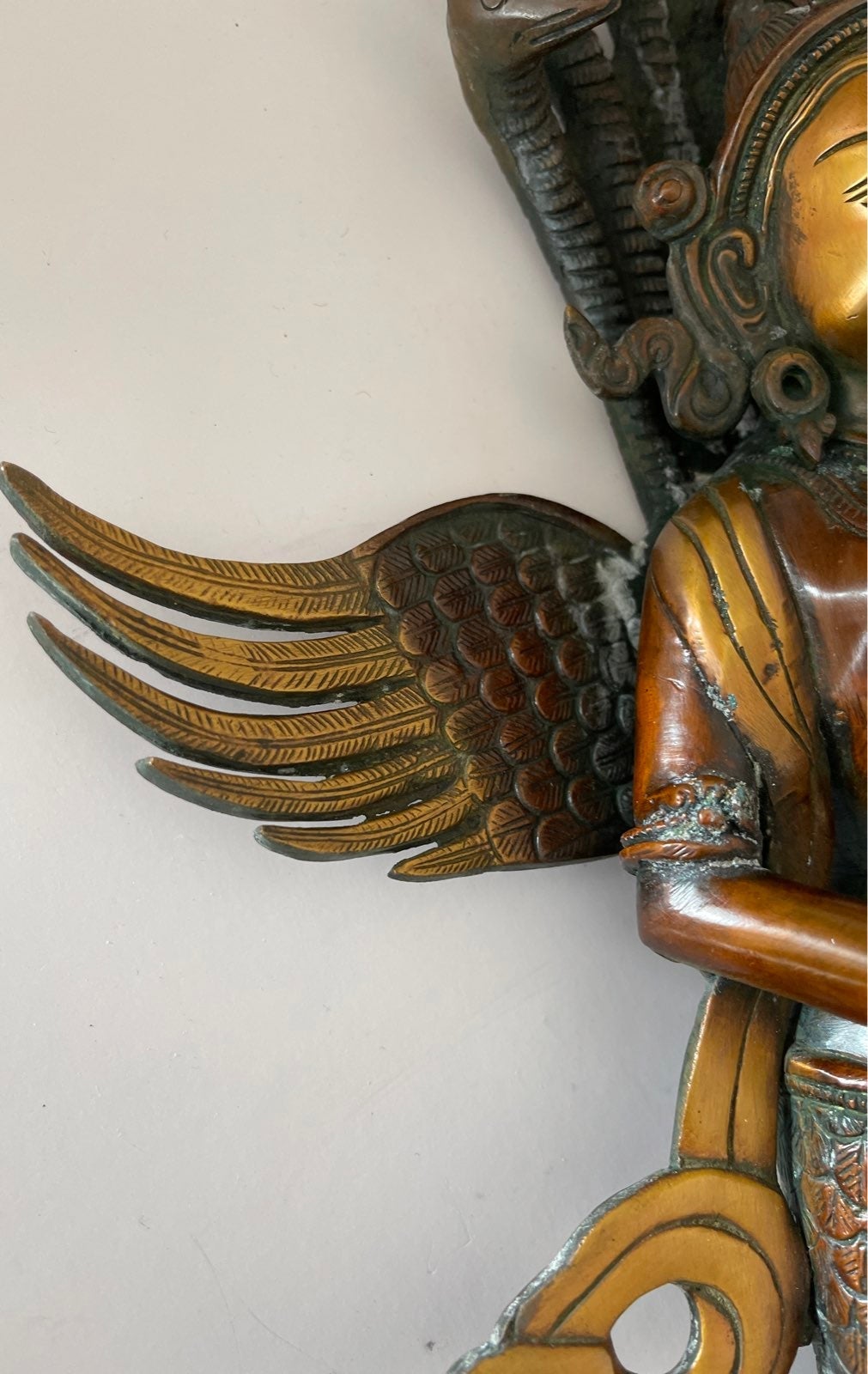 One of a kind statue of Buddha with a seven headed snake watching over him. He has wings on his shoulders and he is holding a conch in his hands.