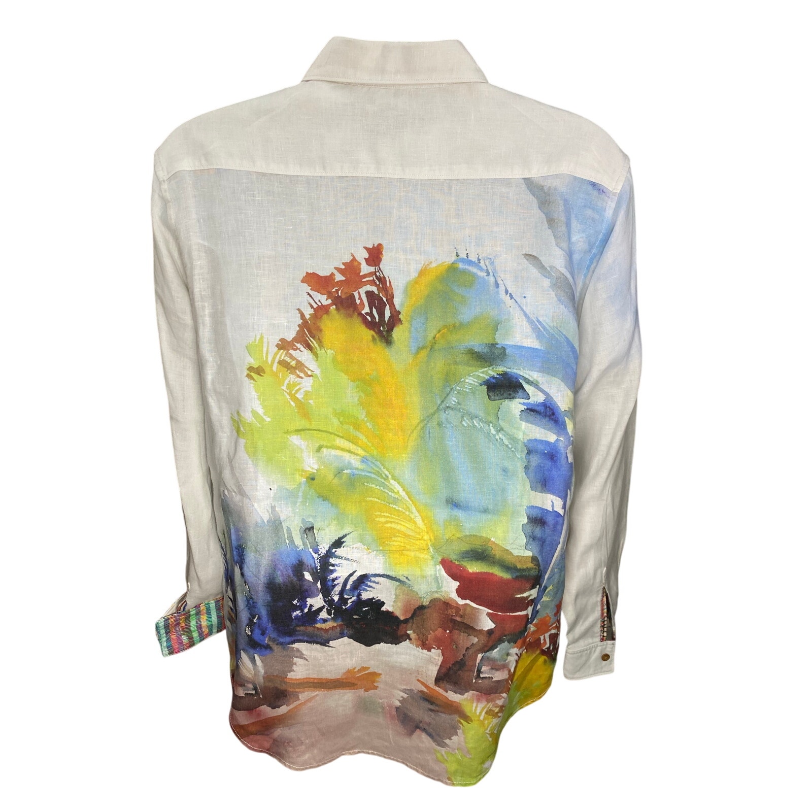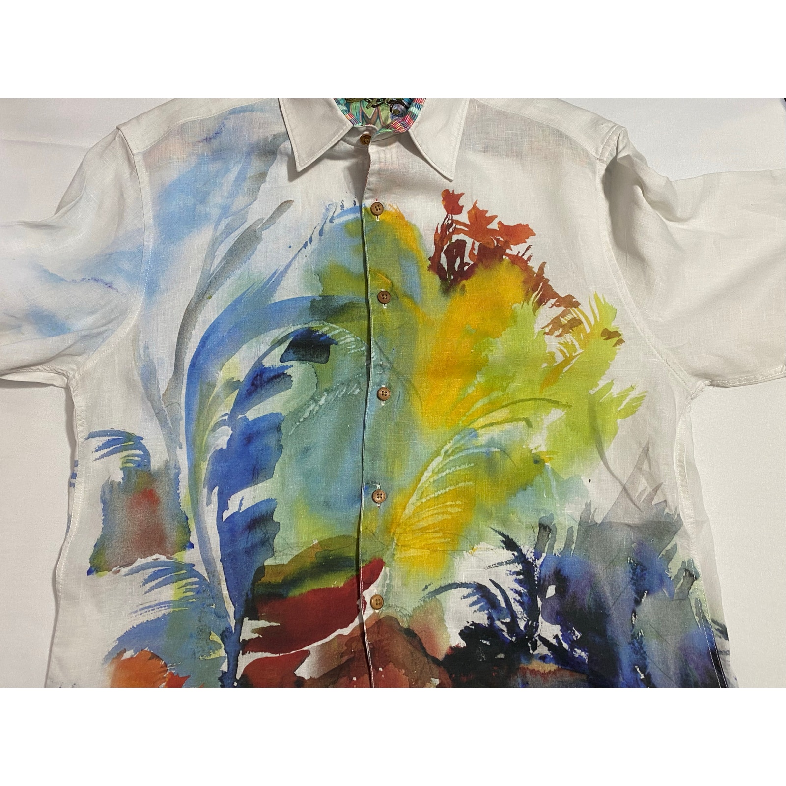 Robert Graham long-sleeve button-up shirt featuring a bold tropical design with palm trees, ocean waves, birds, and vibrant color blocking in blue, green, red, and yellow. Embroidered “Color Guard” detail across the chest. Made from a breathable linen blend for lightweight comfort. Tagged XL. Approx. 24" pit to pit. Pre-owned, excellent condition. See photos for full design and measurements.