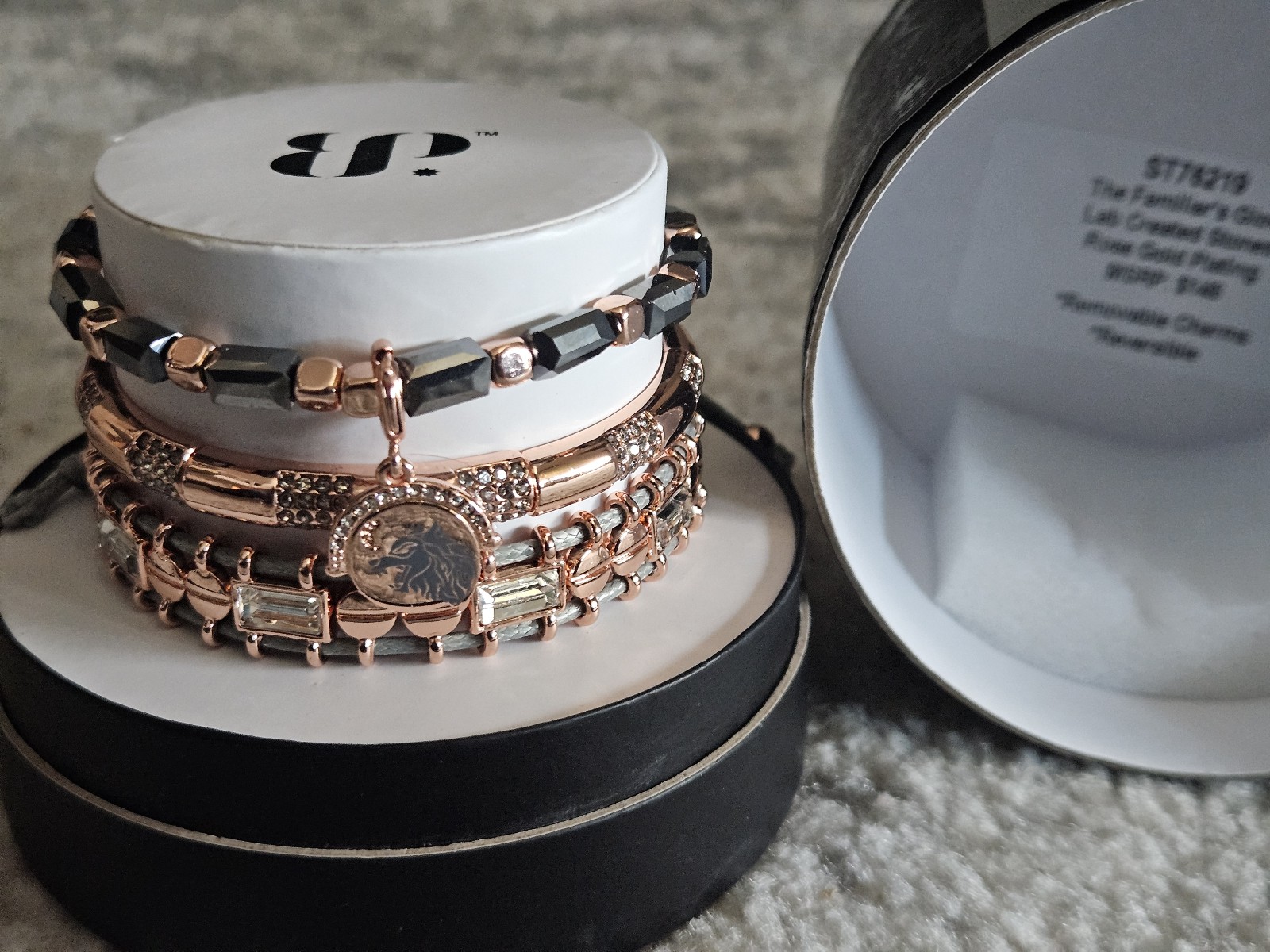 Stack of 3 bracelets featuring lab created stones on 12k gold plating with removable charm.