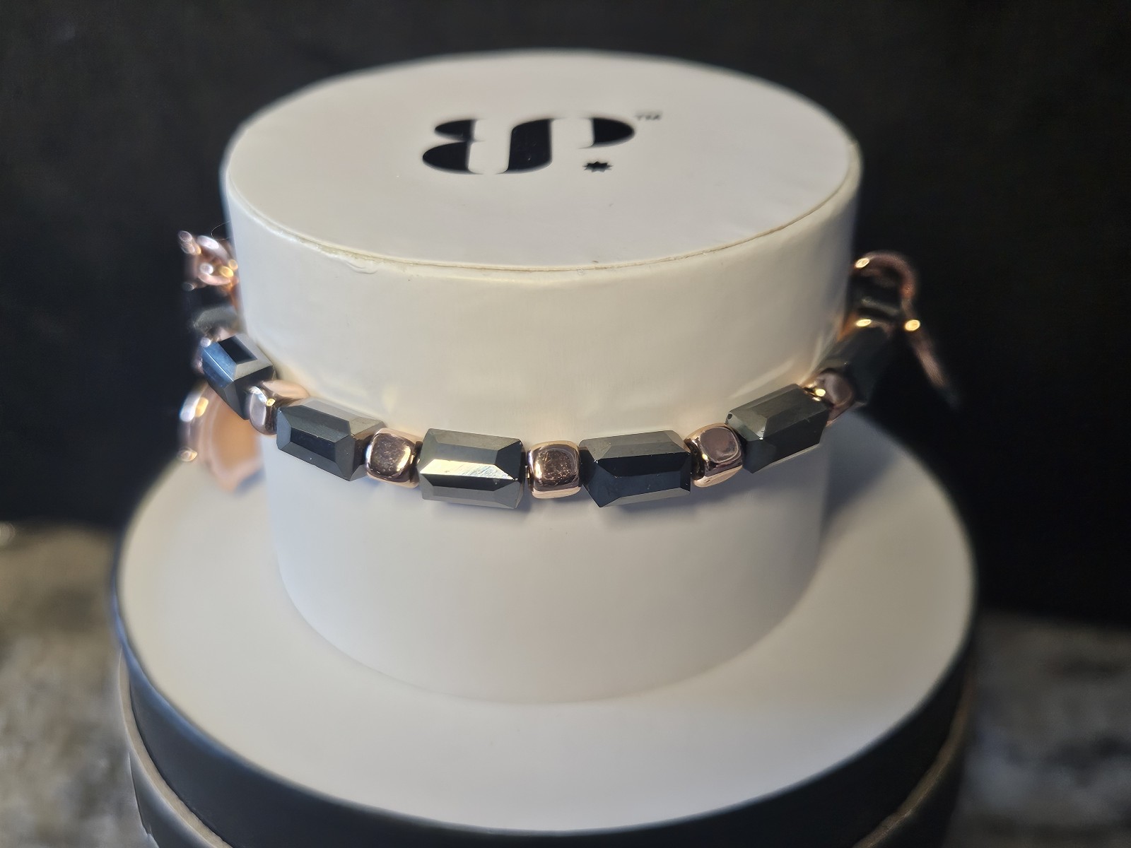 - stretch bracelet with a alternating regtangular charcoal gray beads with square rose gold beads, a "bp" logo charm and removable spring clasp halloween themed charm, a medallion style charm with a wolf and an etched moon featuring clear pave stones on top half