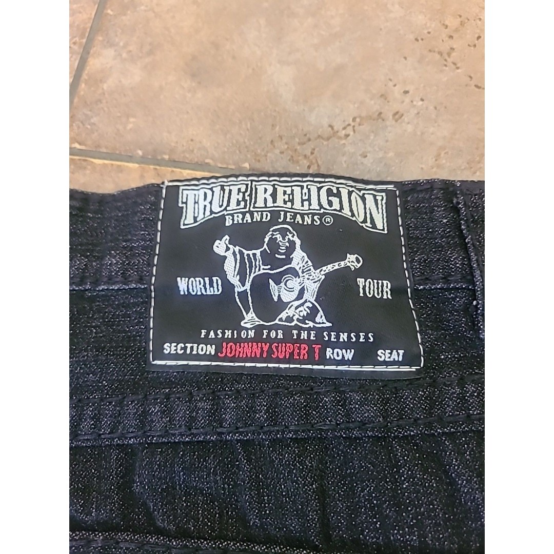 The True Religion Johnny Super T Straight Pant in Black is a stylish and versatile addition to any man's wardrobe. These relaxed fit jeans feature a regular size 38 waist and a 26-inch inseam with wide 9-inch leg opening, perfect for a comfortable and on-trend look. Made from denim fabric, these straight style pants are designed for everyday wear and can easily be dressed up or down for any occasion. The iconic True Religion branding adds a touch of luxury to these streetwear essentials.