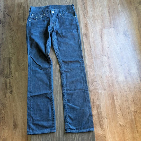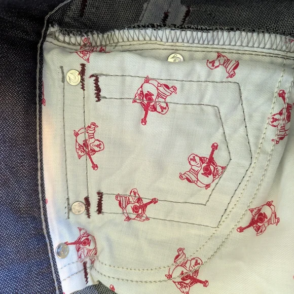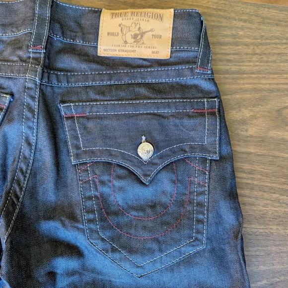 True Religion Men’s Size 30 dark wash straight leg flap pocket jeans BZ Inglorious jeans. Includes large large T detailing with red stitching. This pair is in immaculate condition and have rarely been worn. Patch shows minimal wear and no damage. 100% cotton and machine washable. Measures 16" at waistband, 13" rise from back, 10" rise from front, 33" inseam.Please note that sizing is approximate and colors may vary slightly due to lighting and camera quality. Feel free to ask questions as item is non-returnable.