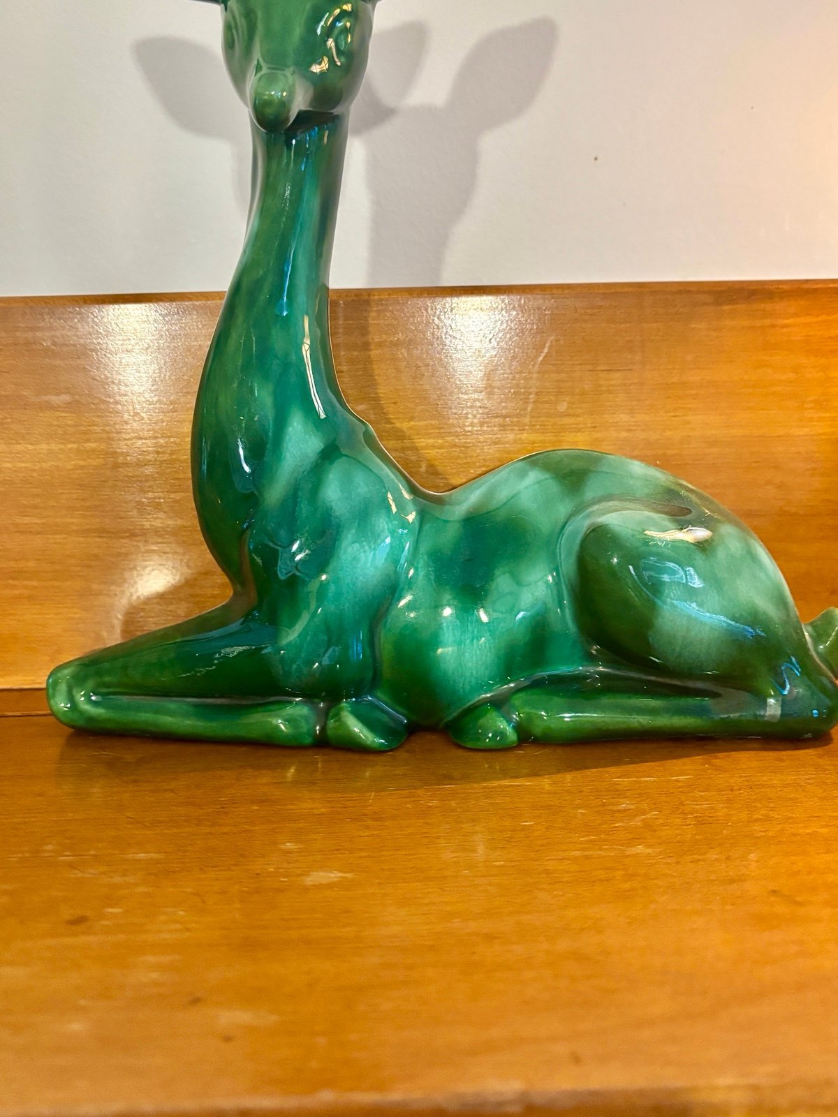 Stunning, whimsical tabletop or garden decor! Behold this fanciful deer/doe/fawn, glazed in a dreamy swirly green. This ceramic figurine is larger than most pieces of its kind. Her detailed eyes, adorably big ears, graceful neck, and serene pose are particularly lovely.