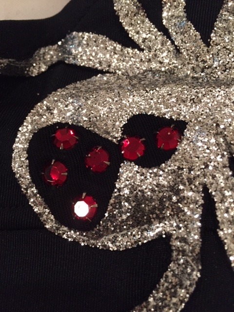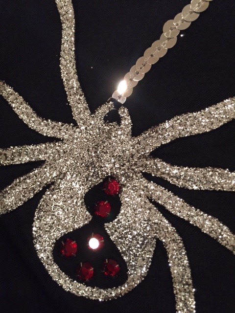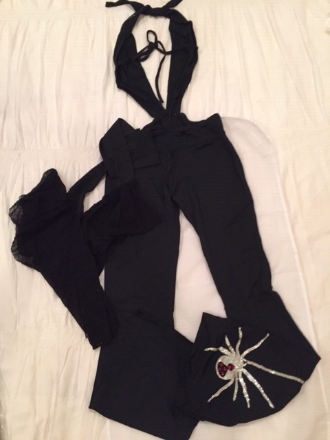 Sexy Witch Spider Jumpsuit Costume. This vintage Nom de Plume sexy witch costume features a stretch knit halter jumpsuit with silver sparkle and red jewel stone spiders and sequin trim. Ties around the neck and back. Includes arm pieces with spider web bell sleeves. No model image of this costume is available, however, posted models are wearing similar top, sleeve and pant styles so you can see how the jumpsuit would fit. Brand new from the designer. 2 Pc. Costume Includes: JUMPSUIT & SLEEVES. Quality made in the USA. Fabric: 92% Nylon, 8% Lycra. Size: LARGE (Dress: 10-12, Bust: 36-38", Waist: 28-31", Hip: 39-41"). Color: BLACK.