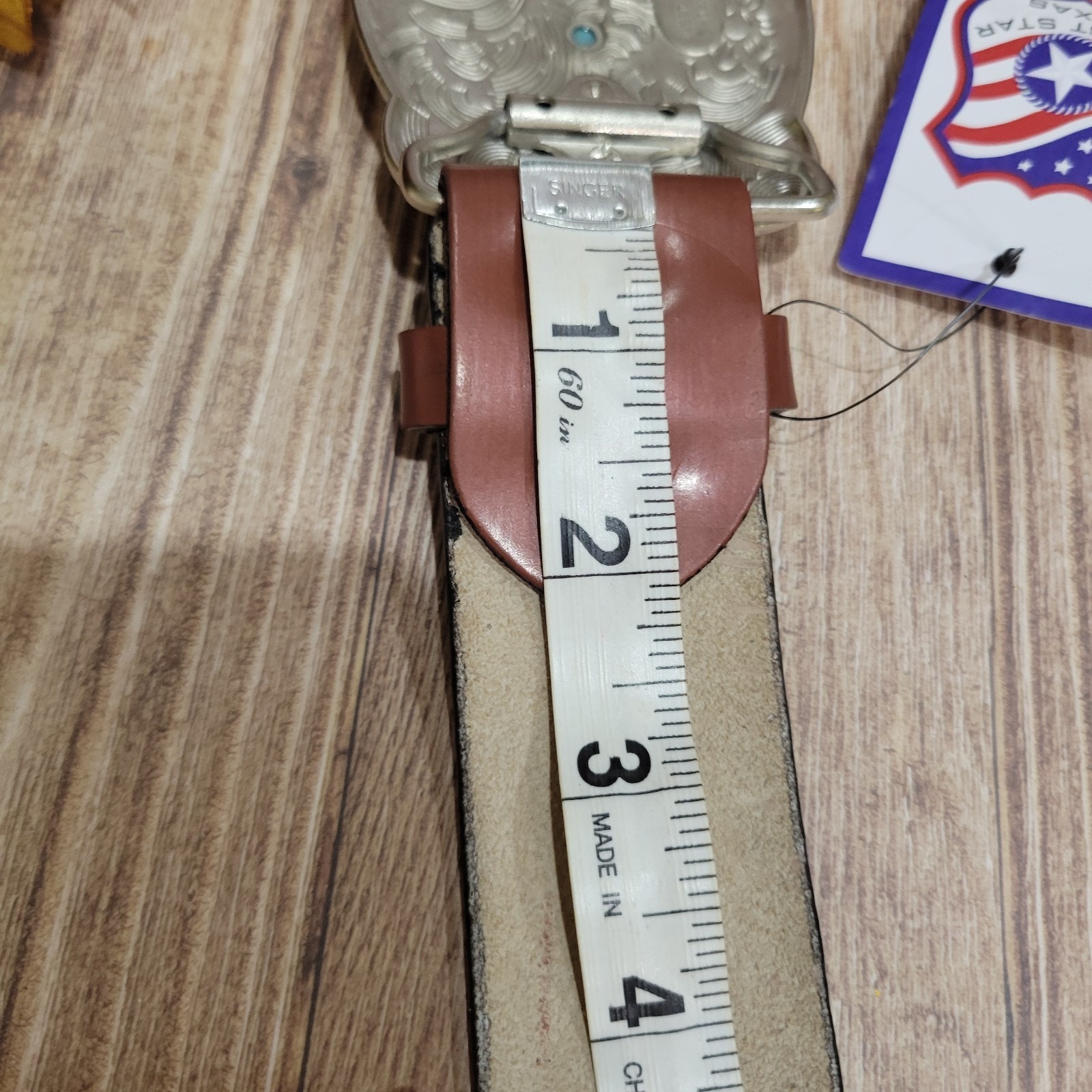 Add a touch of western glamour to your outfit with this stunning women's leather belt. The handtooled and handpainted floral design on the brown leather with a beautiful faux turquoise concho silver buckle brings a unique charm to this accessory. Measuring 1 1/2 inches in width and fitting a size 40, this western belt is perfect for cowgirls looking to complete their outfit. The metal steel hardware and buckle make this belt durable and versatile. The workmanship ensures high-quality craftsmanship. This handmade belt is perfect for anyone looking for a touch of western style.
