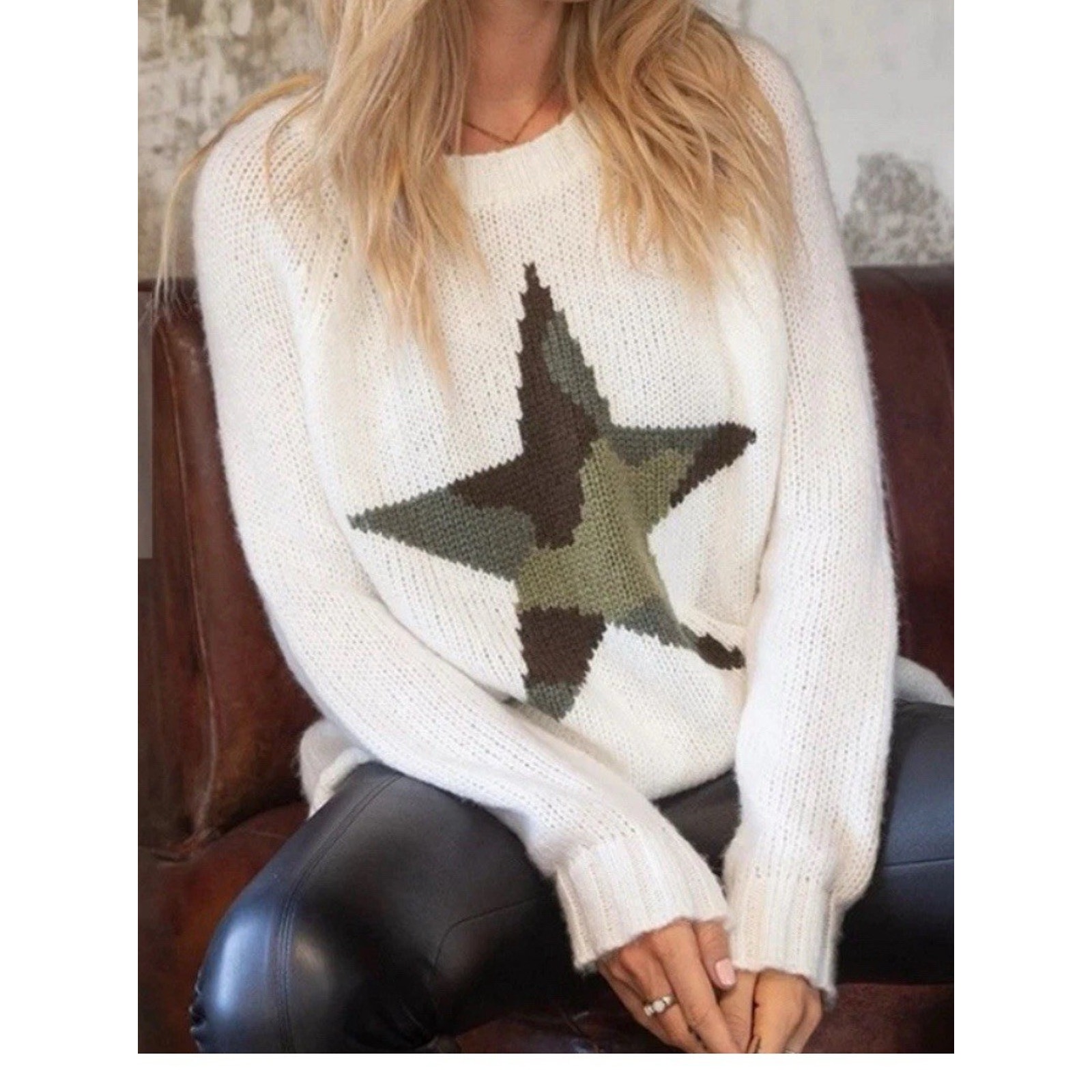 Wooden Ships Paola Buendia Camo Star Raglan Crew Ivory Sweater Pullover Size S/M